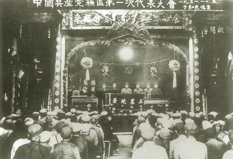 ◆1931年11月1日至5日,中国共产党苏区第一次代表大会在瑞金召开。会议在“左”倾冒险主义者的领导下,对以毛泽东为代表的正确路线进行指责,排挤他对党和红军的领导。主席台右四为毛泽东。
