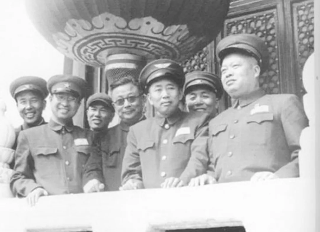 ◆1945年8月,李克农(左一)在延安机场为毛泽东赴重庆谈判送行。