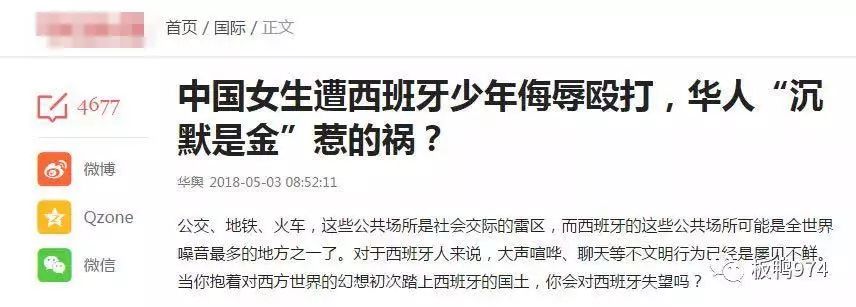 这是小张拍摄的西班牙青年的照片。 在马德里的中国留学生孟欣的话很有代表性:“如果被欺负了不站出来,某些素质不高的人会一直觉得中国人就是忍气吞声。你越怕,他们越来劲。” 还有留学生认为,遇到歧视行为时坚决反抗,也会带动周围的人伸出援手。但首先要确保人身安全,“好汉不吃眼前亏”。 2. 有力:让施暴者知道 “欺负中国人,是要还的” 多名留学生接受记者采访时表示,反抗歧视,不仅要有态度,也要有力度。 此次事件中,小张选择及时报警,同时在网上发帖寻找目击者、搜集证据。 中国驻西班牙大使馆领事部得知小张的遭遇后,第一时间联系西班牙警方,对事件表示关切,敦促警方采取有效措施保护受害者权益,并请警方将案件进展及时通报使馆。 西班牙多家华文媒体也在跟进事件进展,从舆论上支持这名女生。 3. 有节:不必凡事贴上“辱华”标签 尽管这一事件令人愤慨,但当地留学生认为,“歧视中国人”在西班牙并不是普遍现象,不必将少数人群的个人行为上升到“辱华”高度。 在马德里的留学生彦舟认为,世界上哪里的人都是有好有坏,不能一概而论;留学生安妮告诉记者,自己在西班牙生活五六年,从未遇到被歧视的情况。 另一方面,这些青年的行为可能并不专门针对中国人。据统计,2017年,西班牙被曝光的校园霸凌事件接近1500多起,校园霸凌问题已经引起西班牙社会担忧。 留学生彦舟说:“一些中国留学生不擅交际、埋头学习。”这种形象一方面易成为霸凌对象,另一方面被霸凌后中国留学生往往选择忍气吞声、息事宁人。这样又助长了施暴者的气焰。