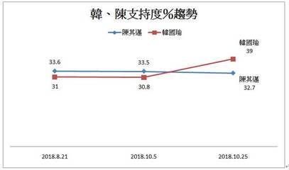 据台湾媒体报道,最新民调出炉,国民党提名的高雄市长候选人韩国瑜支持度为43.1%,遥遥领先民进党提名的陈其迈32.3%,领先幅度高达10.8%。 据报道,台湾竞争力论坛学会今举办“决战大高雄市长选举民调发布会”,结果显示韩国瑜支持度为43.1%,遥遥领先陈其迈的32.3%,领先幅度高达10.8%。而在看好度方面,韩国瑜为42.5%,陈其迈为30.7%,领先11.8%。 据了解,台湾竞争力论坛于10月25日公布的民调结果显示韩国瑜支持度为39%,陈其迈则为32.7%,韩国瑜的领先度首先出现黄金交叉。而此次民调显示韩国瑜的支持度呈现稳定上扬,韩陈两人差距更达10.8%,韩国瑜的支持度首次领先陈其迈达两位数。 此项民调由学会于10月30至31日委托全台公信力民意调查公司进行,相较于上一次10月25日学会公布的民调,韩国瑜当时领先6.3个百分点,领先幅度进一步拉大。民调显示,在11个非少数民族的议员选区,韩国瑜领先了9个,学会执行法谢明辉指出,在深绿的前镇小港地区,韩国瑜领先幅度由13.1%扩大到21.7%,甚至在深绿的三民区韩国瑜更由落后12.7%,逆转成领先3.2%。 不仅如此,韩国瑜在各族群支持度也全面领先陈其迈,不仅是客家人、外省人、少数民族,连本省闽南人韩国瑜也以39.5%领先陈其迈的36.1%。在各年龄层方面,韩国瑜的年轻人支持度大增,20到29岁支持韩国瑜的比率由37.1%增为48.5%,30到39岁则由32.8%增为46.9%,在这两个年龄层陈其迈支持度两次民调都维持3成整不变。韩国瑜仅在60岁以上年龄层民众落后陈其迈6.6个百分点。此外有高达89.5%民众表达有意愿去投票,其中一定会68%,可能会21.5%。 因此谢明辉大胆断言,他可以宣布韩国瑜几乎确定当选,民进党在高雄崩盘,韩国瑜效应很惊人,影响外溢,从嘉义云林一路北上到台北,影响到柯文哲。 至于为何短短一周韩国瑜民调支持度又可以大增?谢明辉分析有两方面原因,一方面10月27日在凤山王金平帮韩国瑜主导的陆军造势活动大成功,蓝军之前在高雄没有这样的场面,感动了蓝营的支持者,如果之后韩国瑜在旗山这种交通较不方便又比较绿的区域也跟凤山一样人很多,几乎可断定陈其迈难以翻盘。另一方面,邱议莹的“陪睡说”帮了陈其迈倒忙,尤其让韩国瑜的年轻人支持率大增。