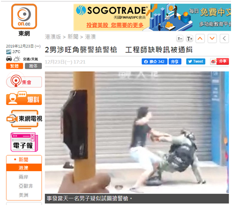 港媒报道截图 报道称,缺席提审被告名为甘维邦(24岁),报称任职土木工程师。他被控于10月13日,在旺角雅兰中心外袭击警务人员、管有攻击性武器,即一支伸缩警棍,以及无合法权限或合理辩解管有另一人的身份证。报道提及,法官在法庭上表示,法庭早前曾发出2个手令,内容分别是甘维邦上报的住址无效,以及其未按时到警署报到。 据报道,案件中另一被告为30岁男子谢信诚,他从事建筑工地工作,被控于同日(10月13日)在旺角雅兰中心外袭击警务人员、意图抢劫,其保释申请早前已被拒。法官应控方要求,将案件押后至明年(2020年)2月17日。 据港媒此前报道,10月13日下午约14时30分,在旺角弥敦道近山东街一带,一名防暴警员追截暴徒,并将一名暴徒按倒在地,随后有数名暴徒上前阻止并殴打警员,期间一人曾企图抢去防暴警员的长枪,一人用长伞殴打该警员,还一人则跳起飞踢警员。报道称,警方事后拘捕2名男子。包括疑似试图抢枪的谢信诚,以及疑似以伸缩棍袭警的甘维邦。