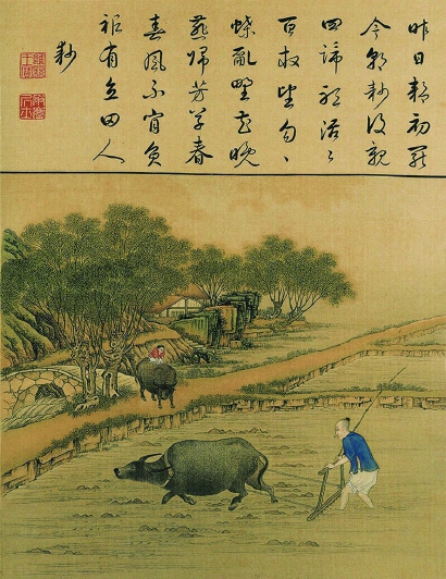 白未闻 农历辛丑年是十二生肖年中的牛年。当我们共同经历了一个充满诸多磨难的鼠年后,便格外盼望着新的一年可以“牛”转乾坤,气象一新;人们都期冀于这个象征勤劳和淳朴的动物,能够为2021年带来平安、富足与祥和。 牛为“六畜”之首,其对于农耕社会的重要性可谓不言而喻。也正因为它与人们的生活息息相关,所以在中外的文学史和艺术史中常常可见其身影。在唐代诗圣杜甫的《卖炭翁》中,牛是古代底层劳动人民悲苦生活的化身(“牛困人饥日已高,市南门外泥中歇”);在鲁迅的名篇《自嘲》中,牛又是奉献精神的最佳代言人(“横眉冷对千夫指,俯首甘为孺子牛”);在北朝民歌《敕勒川》里,牛是北国苍茫天地中的勃勃生机(“天苍苍,野茫茫,风吹草低见牛羊”);而在脍炙人口的《清明》诗中,虽无对牛的直接描写,它却似乎已经自然嵌入在我们对于江南一带如画风景和淳朴民情的想象之中(“借问酒家何处有,牧童遥指杏花村”)。在西方的神话、宗教与艺术中,也同样活跃着牛的身影。 总之,牛便是这样一种可亲、可爱的生灵,在传统的农耕经济中扮演着任谁也无法取代的重要角色。它见证着人类文明的发展与进步,也寄身于古往今来无数的文物与艺术作品间。 勤劳的生灵:《耕织图》里的牛 ![]()