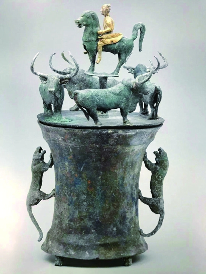 ◆西汉四牛鎏金骑士铜贮贝器,云南省博物馆藏