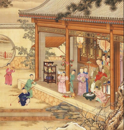 祭祖是春节期间最重要的传统活动之一。中国人讲究慎终追远。在年终之际,人们通过祭祀活动,追思祖德,求福报功,弘扬孝道。 清代,皇帝需提前三日斋戒,并于腊月二十八或二十九日亲自到太庙主持祫祭,可谓郑重其事。自佛教传入中国后,每年腊月初八,京城各寺院都用香谷和干果做成粥来供佛。据《道咸以来朝野杂记》载:“十二月初八日为浴佛日,各寺观煮粥供佛。”届时,清帝会派王公大臣到雍和宫现场看视,煮粥时众多喇嘛围锅念经。粥成后一面供佛,一面先将粥进奉内廷,首先祀祖,然后分赐各宫及内外臣工品尝。所以《燕京游览志》也有“十二月八日,赐百官果粥”的记载。民间亦争相效仿,除供佛祀祖外,也把腊八粥作为亲友间相互馈送的礼物。 清宫亦重视此俗,并有隆重的祭祀礼仪。坤宁宫要设供案,供放神牌、香烛、燎炉,及跪垫等用具,并供陈黄羊一只,各种祭品三十二种,包括关外进贡的麦芽糖等等。皇帝和皇后在主管太监的引领下,分别到佛前、神前、灶神前拈香行礼。 过去老百姓人家常年供有佛龛或神像,到过年时不仅要供佛,还要祭祖。按满洲人的习俗,祖宗的影像或牌位,要供奉在屋内西墙(西墙为尊贵方位),供桌上摆放月饼、水果及各种蒸食炒菜之类,配以香炉、红烛等,极具尊敬之意。清帝以孝治天下,祭祖更是年禧的重头戏。除夕前一日,清帝在太庙(今劳动人民文化宫)前殿举行大祫礼,祫即合祭祖先的意思。也就是将太庙中、后殿存放的努尔哈赤高、曾、祖、父和努尔哈赤及其以下历代帝后的牌位都请到前殿,一起受礼。大典非常隆重,不仅清帝与陪祀官员于前三日就要斋戒,而且到时,午门还要陈设皇帝的法驾卤簿,鸣钟鼓,皇帝乘轿出宫,文武百官齐集午门之外。典礼中,礼部和太常寺官员向神主献太牢、太羹等祭品。皇帝在列祖列宗神位前上香,行三跪九叩大礼,场面庄严肃穆。 [敦亲睦族] ![]()