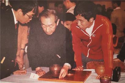 华以刚(右)与聂卫平(左)共同聆听吴清源教诲