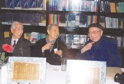 1995年4月,柯灵、施蛰存、王辛笛(左起),在作协大厅出席“资深作家敬慰奖”颁奖仪式