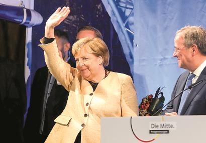 2021年9月21日,时任德国总理默克尔在施特拉尔松德出席基民盟竞选集会。新华社 发