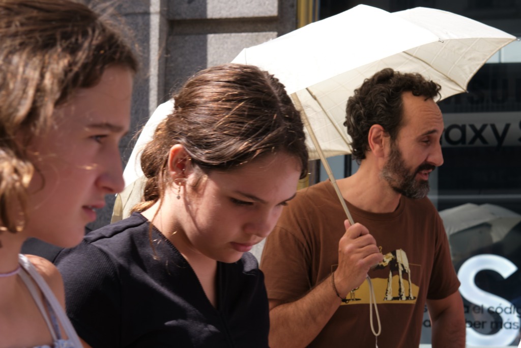 7月20日,一名男子撑伞走在西班牙马德里街头。新华社记者孟鼎博摄