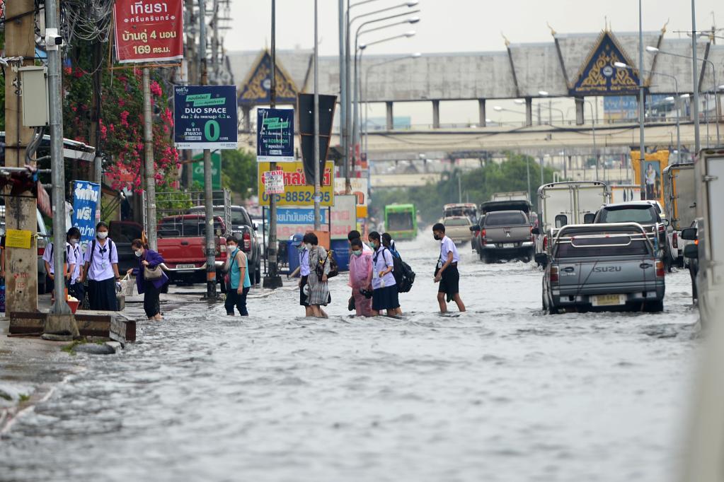 2022年9月13日,在泰国曼谷,人们走过积水的街道。(新华社发)