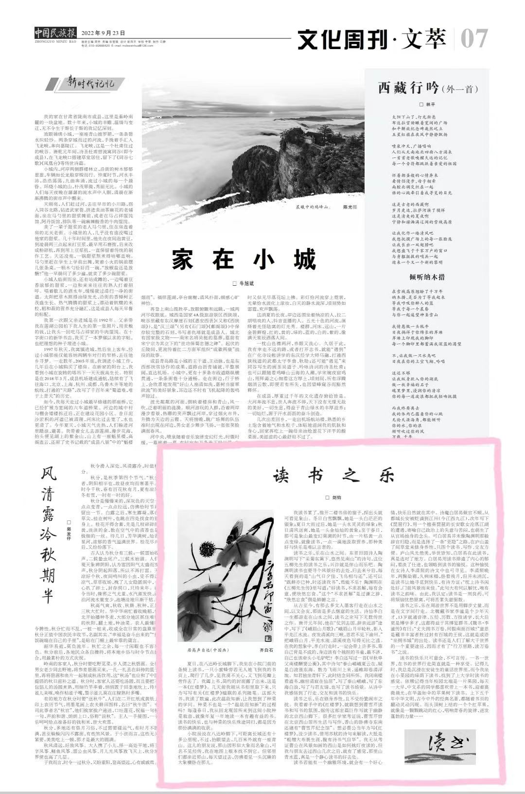 夏日,在八达岭脚下,我坐在门前葡萄架的条椅上读书,头顶是用藤蔓绿叶覆盖的绿荫,身边是块不大,却打出一块块小格子的小菜园,满目的绿叶夹杂着一朵朵可以结实的小黄花。西红柿们在万绿丛中,吐露出一点点红,像一盏盏隐秘的小桔灯;黄瓜们坠在枝蔓上,微风习来,绿叶摆舞,瓜却纹丝不动;还有那割不尽的韭菜们,又萌出一簇簇新绿,远比“离离原上草”的生命顽强…… 一只采花粉的小蜜蜂,旁若无人地从咫尺绿叶丛中,嗡嗡地飞到我的书页上,爬行了几步,见我无动于衷,又很得意地飞到枝蔓的花瓣上劳作去了。我阖上书,露出了简约的封面,那是一部《红楼梦》。我几天前刚从书柜取下来,只为写写有关红楼楹联的系列随笔。这部大书,我读过了数遍,此次温故而知新,让我想到了种菜的学问。种菜不也是一个“温故而知新”的过程吗?每逢春日,我从回龙观来到小院种菜栽苗,就像年复一年地读一本有趣有益的书。读书的快乐,也与种菜的快乐殊途同归,都是为了秋天那满满的收获。 说在八达岭脚下,可这一脚,要迈过十公里,我方能摸到八达岭长城的青砖,不过,抬眼几百米外就有一座青山。这儿的朋友说,那山大名象山,名不见经传,我在地图上根本找不到,但邻里们都亲近那山,每天望过去,就见一头横卧的大象,大象鼻子一直抻到了谷地公园尽头,好像是在沉睡,且一睡就是上万年。 我书读累了,推开二楼书房的窗子,探出头就可看山了。冬日下雪了,她是一头白茫茫的银象;夏日下雨了,她是一头水灵灵的绿象;秋日狂风了,她是一头金灿灿的黄象,至于春日,那可是象山最变幻莫测的时节,由一片片枯黄一点点变绿,就像读书,一点一滴地浸润进营养,让知识的春天慢慢地染绿心田,那种快乐是难以言表的。难怪东晋田园诗人陶渊明,早在1600年前就放着县太爷不干,从江西彭泽跑出来,归隐田园,“采菊东篱下,悠然见南山”了。这位五柳先生的读书之乐,兴许就是伴山而乐吧。 读书之乐,乐在山水之间。陶渊明读书也要寻个风景好的去处,归去来兮后,每天看到的是“山气日夕佳,飞鸟相与还”,还可以“既耕亦已种,时还读我书”,焉能不乐?本来嘛,读书就是找乐,陶渊明在《五柳先生传》里写道:“好读书,不求甚解,每有会意,便欣然忘食。”这个“不求甚解”是过谦之辞,“欣然忘食”倒是肺腑之言。读书读到废寝忘食,那该是怎样的一种乐趣? 从古至今,有那么多文人墨客行走在山水之间,走走路,读读书,以书会友,以文会友,那该是多么惬意的生活。诗仙李白一生都游走在山水之间,读书之余写下无数传世之作。开元十四年(公元726年),他在“仗剑去国,辞亲远游”途中,写下了《峨眉山月歌》:“峨眉山月半轮秋,影人平羌江水流。夜发清溪向三峡,思君不见下渝州”,把个峨眉山月、平羌水流、清溪夜色写得那叫个透。在我想象中,李白行走时,一定会带上许多书,靠自己背是不成的,身边该有个挑担的书童,最不济,自己也该牵头小毛驴吧?李白写过一首《早秋单父南楼酬窦公衡》,写了泰山嵯峨,写了东海白波,写了与君友情,也写了读书场景:“我闭南楼看道书,幽帘清寂在仙居。”这是否在写旅途中读书的场景,我就不得而知了,但从诗中,我感悟到了行走、交友和读书的快乐。 读书之乐,乐在修身养性,且不受纷繁闹市之扰。我看到手中的《红楼梦》,就联想到曹雪芹读书和写书的氛围。据传这部宏篇巨作就写于幽静的北京西山脚下。很多红学家考证说,曹雪芹曾在这一带生活与写作,在香山的卧佛寺东南还建有“曹雪芹纪念馆”。想必曹公当年为写《红楼梦》,也没少读书,那么多引经据典,若非满腹经纶,岂有写《红楼梦》的底气?借用苏轼的诗句来解读,人家那叫“胸有诗书气自华”。我无从考证曹公在风景如画的西山是如何挑灯读书的,但我与朋友去过西山几次之后,就有了感觉,那里山青青水蓝蓝,真是一个静心读书的好去处。 读书若能有一个幽雅环境,就有助于落一个好心情,快乐自然就在其中了。诗魔白居易做官不顺,一度从都城长安,贬谪到江州,次年写下了《琵琶行》,以一个擅奏琵琶的长安名妓沦落江湖的遭遇,寄托了自己政治上失意与苦闷,也萌生了从官场抽身的念头。可聪明的白居易并未像陶渊明那般辞官归隐,而是选择了一条“吏隐”之路,一边挂着闲职,一边在庐山盖了间草堂来修身养性,只图个读书、写作、交友方便。庐山风光绝美,举世皆知,白居易在此读书,真是选对了地方。他写过一首《读书》诗:“幽沉谢世事,俯默窥唐虞。上下观古今,起伏千万途。”从诗句中,可见白居易用读书排遣了内心的郁闷,看淡了仕途,也领略到读书的愉悦。这种愉悦在女诗人李清照的诗文中也可寻见。李清照晚年,两鬓染霜,久病床榻,卧看残月,但并未消沉,是读书让她寻觅到快乐,有诗为证:“枕上诗书闲处好,门前风景雨来佳”(《摊破浣溪沙·病起萧萧两鬓华》)。此句大有何以解忧,唯有读书之韵味。由此,我认定:读书是一剂良药,可将烦恼驱赶,可将忧愁驱离,可将苦累驱走,可将失意驱散。 读书之乐,乐在周游世界,不是用步丈量,而是在文字间行走。北魏藏书家李谧是个少年天才,十三岁就通音律、五经、医卜星相等学问,长大后更是博学多才,这都得益于博览群书。《魏书•李谧传》有曰:“丈夫拥书万卷,何假南面百城?”意在藏书富者为拥“百城”。这就是成语“坐拥书城”的出