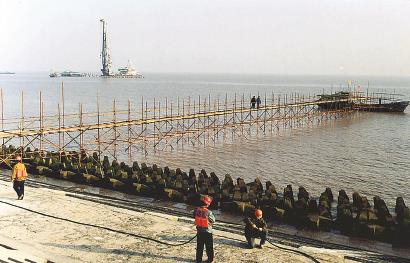 2002年,工人在金山漕泾的上海化工区架设栈桥。 资料图片