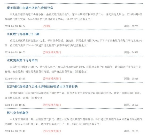 账号为“壹哥哥”的重庆市民拍摄视频称,他们小区当天停气,而打开水龙头后,气表仍然在转动计数。其后,燃气公司对其情况的回复称,可能是管道中还存在余气导致该特殊情况。 在问政平台上,家住康美街道江山樾小区的市民投诉称,其燃气由重庆燃气集团供气,家中长期只有二人居住。2024年4月8日缴纳燃气费用发现,2024年3月份燃气费用涨到了270元(其中3月气费248.15元,垃圾费24元),调查去年缴纳费用发现,平均每月燃气费用在50元左右。家中无增加常住人口情况下,燃气费用会增加到5倍之多吗? 重庆两江新区燃气公司对此的回应称,该用户家中气表为远传智能表,每两个月抄表一次,受2024年4月燃气调价影响,本次抄表周期由原60天抄表延长至抄表84天,期间所用113方燃气量费用共计248.15元。因此不存在燃气用量及燃气费用突然增高的情况。 重庆燃气4月10日发布公告表示,针对市民关于燃气计量问题,将开通燃气计量免费复核服务快速通道。提供抄表账期、抄表读数、气价、缴费时间及金额等24小时在线查询。安排专业人员为客户免费提供燃气计量上门复核服务,对气表运行状况和用气安全进行检查,对抄表读数、抄表账期进行复核。 重庆燃气董秘办4月11日下午对时代周报记者表示,已经有专门的人工客服热线,专门处理这个问题。对于重庆有多少新换表用户数量和相关投诉情况,他表示也只有咨询经营部门。 重庆燃气最新2023年业绩快报显示,其2023年营业收入为102.46亿元,同比增长17.26%,营业利润5.6亿元,同比增长28.86%。报告期内,实现燃气销售量34.96亿方,同比增长 0.24亿方,增幅 0.69%。 重庆市场监督管理局4月10日深夜发布公告称,已经紧急约谈了重庆市重点燃气企业,并组织专项检查。目前,已经开通消费者投诉举报和燃气表送检绿色通道。如果怀疑燃气表存在计量失准问题,可将燃气表就近送至重庆市法定计量检定机构进行检验,也可送至市外法定计量检定机构进行检验。如果发生燃气表计量纠纷,可依据《仲裁检定和计量调解办法》,向当地市场监管部门申请计量仲裁检定。 针对燃气表更换问题,重庆市渝北区市场监督管理局此前对投诉回复称,根据《中华人民共和国计量法》、《重庆市计量监督管理条例》、《中华人民共和国强制检定的工作计量器具检定管理办法》、《国家市场监督管理总局2020年第42号公告》和《中华人民共和国计量检定规程JJG577—2012》的规定:居民家用的以天然气为介质的用于贸易结算的燃气表只做首次强制检定,限期使用,到期更换,使用期限一般不超过十年。 针对新表走的更快,渝北区市场监督管理局表示,通常情况下天然气表是越用越慢。因为气体中有杂质,会在表中沉积,使表的转动阻力变大;另外,随着表的运转磨损,会产生内漏;还有一些部件不断老化,运转阻力也变大。因此,新表比老表一般感觉是快。 调查组进驻,倒查三年台账 4月12日晚间,重庆宣布组建联合调查组对重庆燃气进驻。 据悉,本次联合调查组由重庆市市场监督管理局牵头,重庆市经济信息委、重庆市发展改革委、重庆市国资委、重庆市公安局等相关部门组成,将对市民反映的气表质量、燃气质量、气表计量、价格、收费、服务等方面进行全面调查。 重庆市市场监督管理局唐英瑜表示,已经抽调重庆市场监督总队和区县市场监管部门执法力量,组建4个专项检查组,进驻重庆燃气、凯源燃气等重点企业,对燃气公司近3年的采购情况、销售台账、政府定价执行等情况进行认真核查,重点核查违规收费、违反政府定价、抄表估算有误等违法违规行为。持续深化市场监管领域燃气专项检查行动,进一步拓展企业覆盖面,重点检查天然气经营企业是否存在擅自提高天然气销售价格、是否存在不严格执行阶梯气价政策行为、是否存在不严格执行调价文件行为、是否存在不执行燃气优惠政策等行为。 重庆市场监管局还表示,在核查过程中如发现有其他违规违纪行为,将及时移交相关部门处理。 除了查公司,消费者反映的气表问题现场调查也将加大力度。 重庆市局执法总队和区县市场监管部门抽调了专人组建了另外7个现场调查组,根据消费者投诉举报情况,开展入户核查调查。 由各区县市场监管局组织专业力量,随机在江北、九龙坡、巴南、荣昌等4个区共16个住宅小区和11家供气企业库房、工地对燃气表进行抽查,主要是抽查反映问题比较集中的几个小区,为了确保抽检的公正性,采取异地送检的方法,将抽样燃气表送至中国测试技术研究院、成都市计量检定测试院进行检定。目前来看,送检燃气表均在检验过程中。 重庆经信委副主任涂兴永表示,截至4月12日,共受理咨询和投诉7362件,目前正在有序核对和处理之中。同时,还督促重庆燃气集团等企业开展自查自纠,目前已完成20多万户用户筛查,对用户用量增幅较大的,通过线上沟通、上门核查等方式,逐一进行复核,并及时解决。 而也就是在4月12日,重庆燃气还发布公告称,截至目前其复核的气表均没有问题。 多家涉气公司盈利大增 截止目前,重庆燃气并未披露其2023年年报,不过,从其已经披露的2023年业绩快报显示,在2023年四季度,其营业收入和营业利润均呈现快速增长,尤其是营业利润,增幅超过十一倍。 重庆燃气2023年业绩快报显示,其2023年营业收入102.46亿元,同比增长17.26%,营业利润5.65亿元,同比增长28.86%,归属上市公司