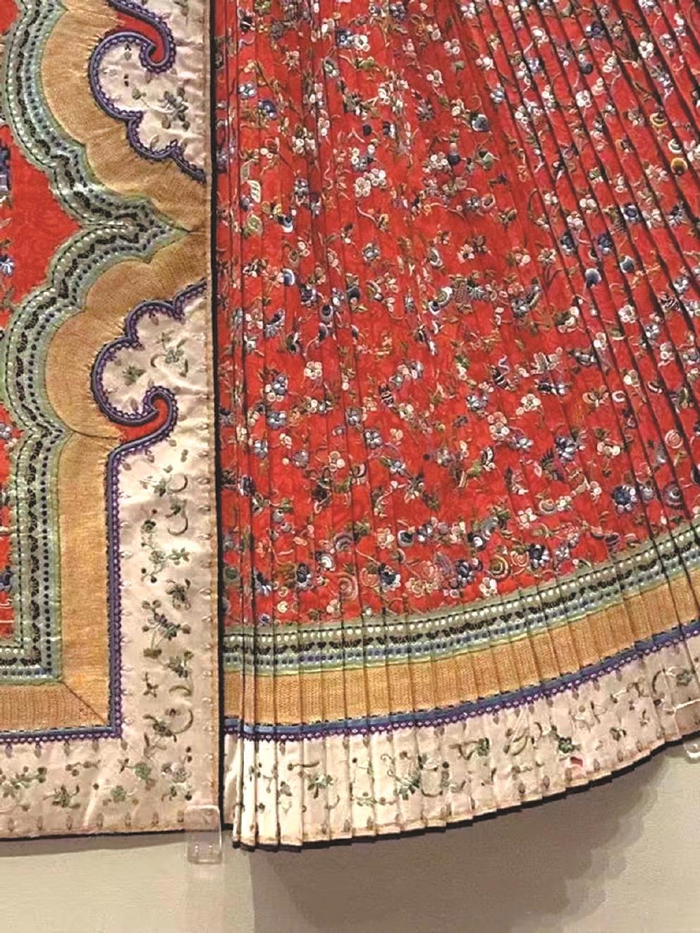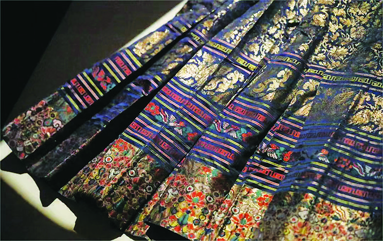 山东博物馆藏明代蓝色缠枝四季花织金妆花缎裙局部。