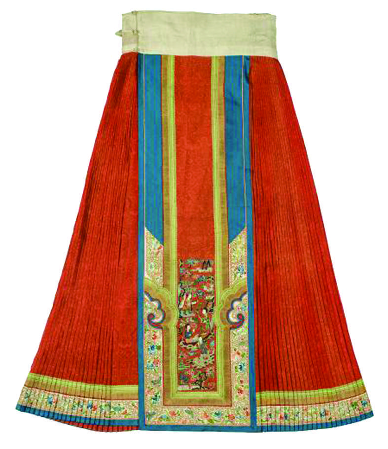 ![]() 明代佚名画家创作的绢本设色画《明宪宗元宵行乐图》中,出现了许多身穿马面裙的后妃们。图为该画局部。 ![]() 电视剧《尚食》中出现了明代马面裙。 ![]() 清代流行百褶马面裙。图为清华大学艺术博物馆藏清代红色暗花芝麻纱绣人物地景纹鱼鳞裙。 ![]() 清华大学艺术博物馆藏清代暗花绸绣鱼鳞裙局部。 贾玺增 最近一段时间,历史悠久又融合了当代生活美学的马面裙成为“国风”顶流,引领了新中式时尚潮流,也见证着人们心中日渐升腾的文化自信。 马面裙的历史究竟有多长?曾历经多少变化?又如何凝结着中国古人的制衣智慧与美学风尚? ——编者 马面裙是中国传统服饰中十分经典和极具代表性的款式,历史源远流长,外观独特,工艺精美,功能合理,凝聚了中国传统服饰文化美用一体、以文载道的人文思想。 就造型结构而言,马面裙由一条裙腰、两片长方形裙身组成。每片裙身的左右两侧各有一个裙门(两片裙身共计四个裙门),穿着时,两片裙身的裙门在前身和后中部位两两重合,形成里外裙门相互搭叠、遮掩的形制,外观只可见两个马面裙门,其式样与宋代二片式旋裙类同。明代马面裙两侧打活褶,清代马面裙裙身无褶或打一厘米宽的细褶裥,抑或在细褶间绗缝固定,形成鱼鳞状褶裥;明代马面裙裙身有装饰性裙襕,清代马面裙在外露裙门和裙身上刺绣花卉、禽鸟等装饰图案,内裙门则无装饰。马面裙的纹样主要集中在裙摆的位置,下繁而向上逐步简化,纹样题材都是具有美好寓意的纹样并且纹样间相互组合。 马面裙的衣身开合方式、裙门叠压、褶裥结构、图案装饰、文化内涵等要素综合形成了其运动性、遮蔽性、装饰性和礼仪性共存的特色,可谓中国古人高度发达的独特制衣智慧与美学特色的体现。尽管社会发展、时代更迭,人们的生活方式和着装习惯发生了巨大变化,但马面裙穿越百年时光历久弥新,依然散发着独特魅力,不仅受到传统服饰和汉服爱好者的喜爱,亦在国际时尚舞台被西方时装品牌和设计师们重视和追捧。 马面裙裙门相交的式样,活动性与礼仪性兼备 马面,也称敌台、墩台、墙台,最早见于《墨子》中的《备梯》与《备高临》,因外观狭长形如马面得名。它是探出城墙的一个T型结构,可与城墙形成角度,以便消除城下死角,自上而下从三面攻击敌人。陕西省榆林市神木县的“史前中国第一大城”石峁遗址内有着现存最早的马面实物遗址。 将“马面”用于服饰,可见于明代太监刘若愚《酌中志》关于“曳撒”的记载:“其制后襟不断,而两旁有摆,前襟两截,而下有马面褶,两旁有耳。”“曳撒”是一种长袍,亦作“曳”“一撒”,其制为裙袍式袍服,本为从戎轻捷之服,以纱、罗、纻、丝为之,大襟右衽、长袖。衣身前后形制不一,后身为整片;前身则分为两截,腰部以上与后片相同,腰部以下两边折有细褶,中间不折,形如马面,两腋缀以摆。 马面裙裙门前后交掩的式样可溯源至宋代“前后开胯”的“旋裙”。《宋史》列传第二百四十六记载:“旋裙重叠,以多为胜。”据司马光记载,“旋裙”因便于乘骑,宋初流行于京都妓女之中,后影响至士庶间。其实物如福州南宋黄升墓出土褐色牡丹花罗镶花边裙,长83厘米,腰头11.7厘米,腰宽123厘米,下摆宽133厘米,“用四片料子分缝,每两片竖直缝接成块,然后按三片宽度上下相对错叠,居中的一块大于两侧,顶端合缝,下摆未缝,裙身两层可以自由离合。上部另加裙腰,两端缀系裙带。”因其前后交掩、自由开合,在日常生活中穿着方便,穿者迈腿步伐稍大时,两侧裙片自然分开,行动非常便捷。这种二片式结构被明代马面裙和清代马面裙继承了下来。裙门相交的式样与中国古代流行的开衩袍结构类似,既便于活动,同时还能遮蔽身体,不暴露内衣,具有较好的礼仪性。 马面裙是明代女子的特色服饰,以对于褶与装饰性裙襕的强调为显著特征 明代女裙以马面裙最为流行,也最具知名度。《嘉靖太康县志》载:“弘治间,妇女衣衫,仅掩裙腰;富用罗、缎、纱、绢,织金彩通袖,裙用金彩膝襕,髻高寸余。正德间,衣衫渐大,裙褶渐多,衫惟用金彩补子,髻渐高。嘉靖初,衣衫大至膝,裙短褶少……”这成为马面裙在嘉靖年间流行的记录。明代佚名画家创作的绢本设色画《明宪宗元宵行乐图》中,出现了许多身穿马面裙的后妃们。 明代马面裙分前后二片,并用一个裙腰,中间交叠部位无褶,裙门外形为长方形的“马面”。明代马面裙又一重要特征则是,在裙门的两侧打活褶,这极大地增加了裙身的活动空间,使裙子具有较好的使用性能。其实物如首都博物馆藏北京丰台区长辛店618厂明墓出土明中期驼色缠枝莲地凤襕妆花缎裙,驼色缠枝莲缎地,两大片组成,每片221厘米,用裙料三幅半,幅宽60厘米。裙腰用绸单上,两侧各一袢,腰两端各一根丝带,两胯三个对褶。裙襕宽12厘米,妆花翟鸟图案。又如宁靖王夫人吴氏墓出土折枝团花缎马面裙,长78厘米,裙为两片布交叠共腰而成,每片布由三幅半的织物拼缝而成,幅宽60厘米。 明代中晚期,马面裙中的“襕饰”出现不同的装饰方式。裙底以及膝盖位置饰以各种纹样的宽边,称为“襕”。“襕”的结构源于战国至汉代流行上下分裁的深衣。隋代出现了襕袍,宋代襕衫之“襕”指的是服装衣身下摆处的“拼布”缝线。 因所饰部位不同,明代马面裙“襕饰”可分为膝部位的膝襕和裙底摆部位的底襕