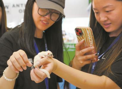 观众在宠物展览会上与蜜袋鼯互动。 新华社发(资料照片)