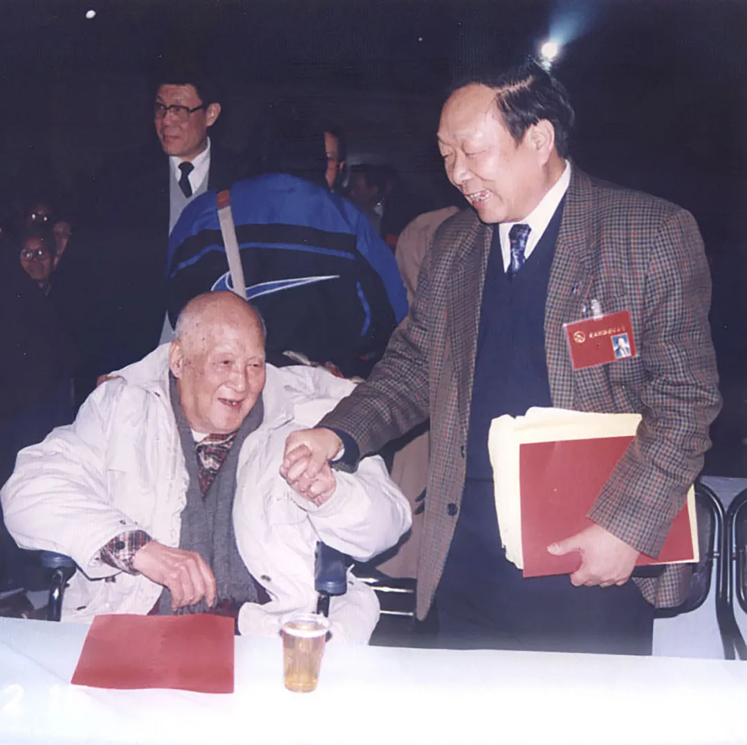 ·1998年12月,李德仁(右)为王之卓组织90大寿学术活动。(武汉大学供图)