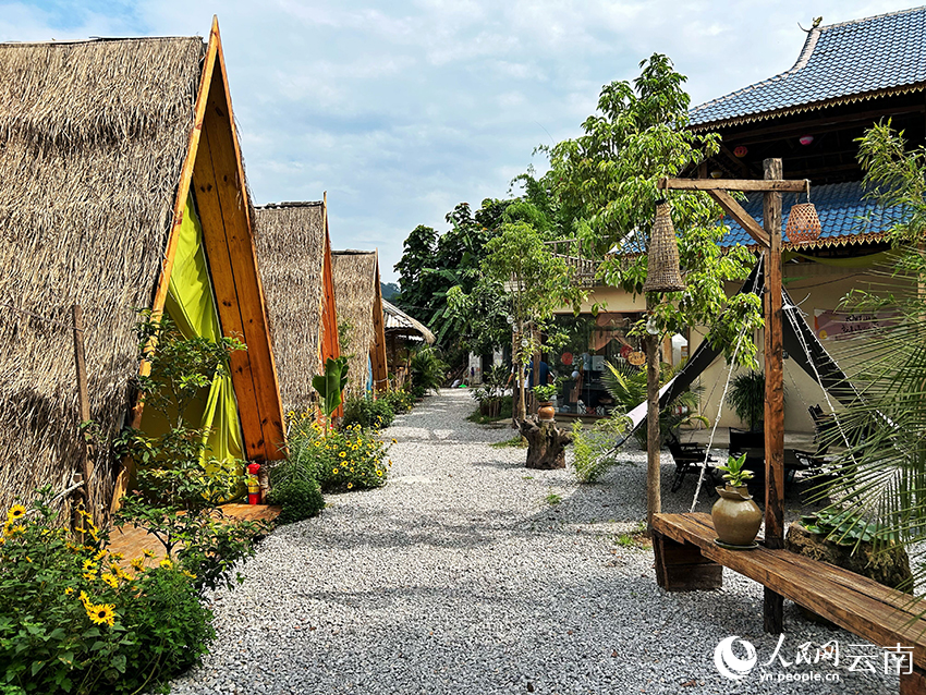 “陈老板,先来一盘柠檬舂鸡脚,还是老位子!”一位常客的声音在院门口响起,随即,小院内脚步声渐密,欢声笑语涌入院内,小院一下“热”了起来。尽管开业还不到半年,但因环境优美,特色小吃、练歌房等一应俱全,陈忠精心打造的集餐饮、休闲于一体的小院迅速在周围村寨积攒起了人气,每逢节假日或周末,院内座无虚席。 坐在悦庭楠舍小院,眼前一条由碎石铺就的小径向远方延伸,小径两旁,几间洁白的帐篷与茅草搭建的小屋错落有致,与周围的绿植和花卉相映成趣。小院旁一片平坦的石斛地向远处延伸,田地尽头,竹林茂密、苍翠欲滴,中老铁路的铁轨也掩映于此。站在小院露台,陈忠指着远处连绵群山说:“那边就是老挝了。” ![]()