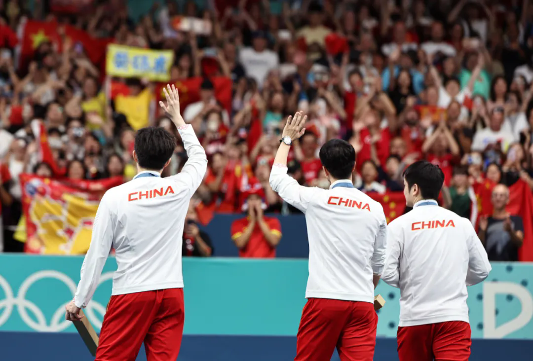 ▲8月9日,中国队选手王楚钦、马龙、樊振东(从左至右)在颁奖仪式上向观众致意。(新华社)