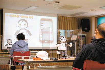 老人们在韩国首尔阳川区一处老年福利文化中心学习如何利用数码教学机器人“LIKU”掌握智能手机使用技能。新华社资料图片