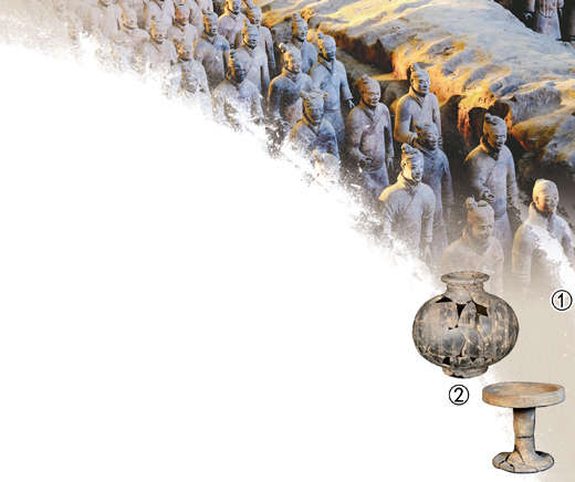 图①:兵马俑一号坑。 图②:秦始皇陵西1号墓出土陶器。