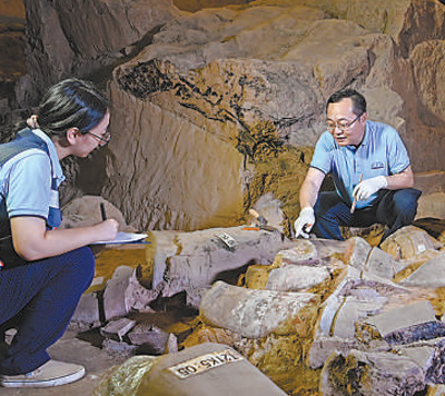 秦始皇帝陵博物院院长李岗(右)与项目组成员现场分析高级军吏俑出土现状。