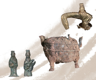 秦始皇陵西1号墓出土金器和铜器。