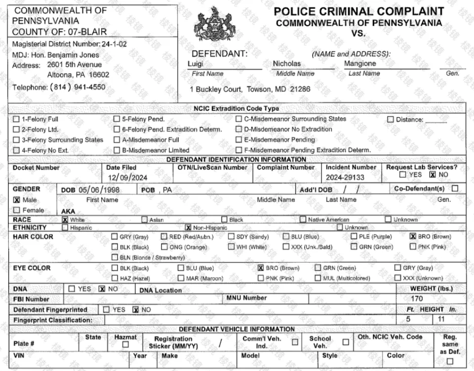 《棱镜》获取的一份宾夕法尼亚州警方的文件,详细描述了抓捕的过程,文件显示:枪手曼吉奥内身高约180cm 体重约77公斤