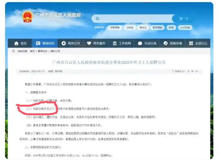 Photo from 杭州日报 2025年2月19日下午,白云区新市街道办事处对此发布的回应称,本次招聘搬运、司机岗位,主要从事生活垃圾人工装桶、搬运及转运处理,工作强度较大且需在夜间和凌晨作业,对于体能等身体条件要求较高,基于以上原因设置了相应年龄条件。 猪肉佬T先生查了一下广州市环卫工的工资待遇。