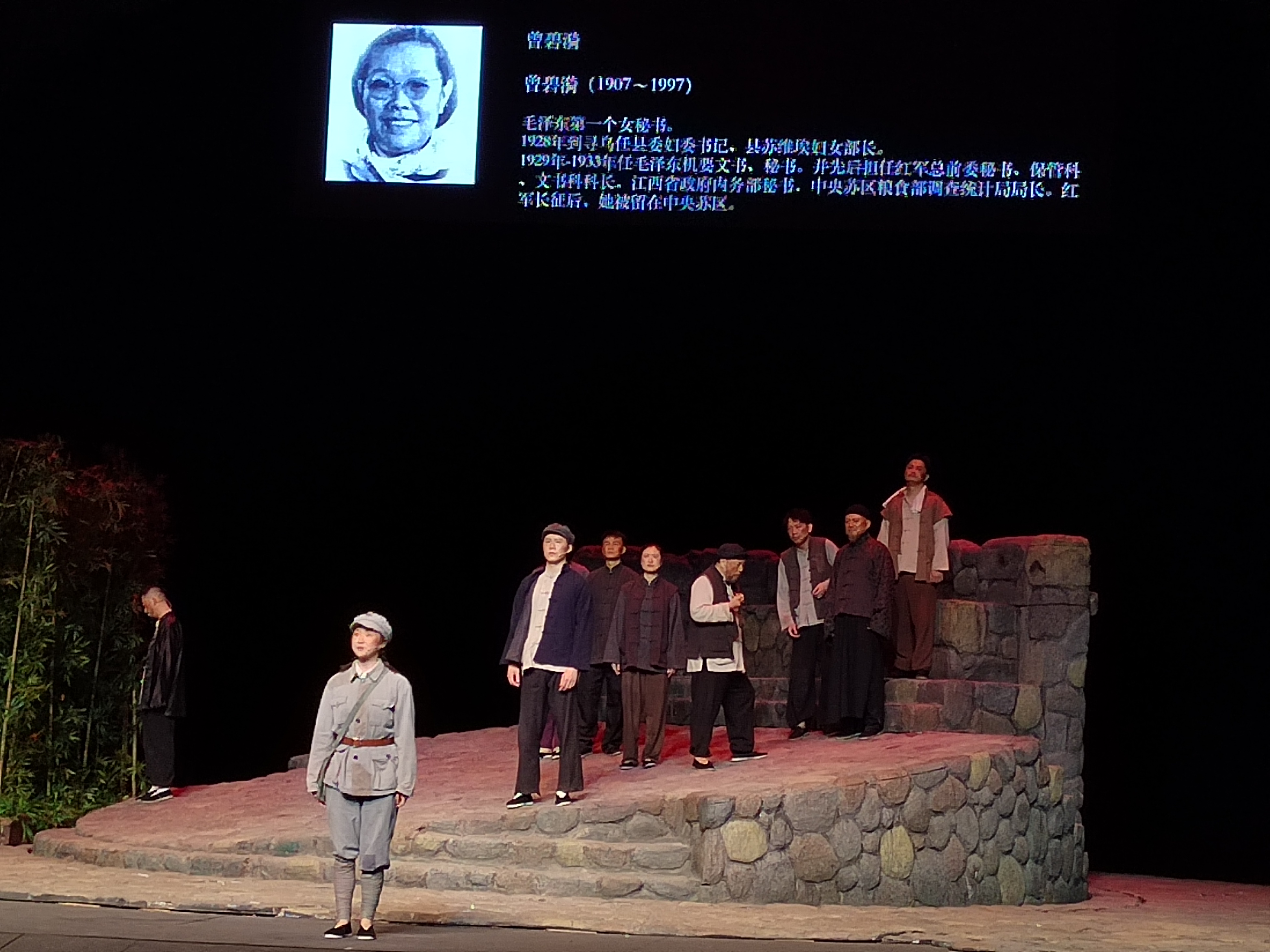 舞台上,寻乌的山水人文栩栩如生;音乐声里,江西民歌与革命交响乐巧妙融合,营造出浓厚的历史氛围;道具细节处,一把旧藤椅、一盏煤油灯,都经过精心设计,诉说着那段峥嵘岁月。背景上的历史照片,显示了剧中人物是有真实的原型的,让人对这些革命前辈肃然起敬。