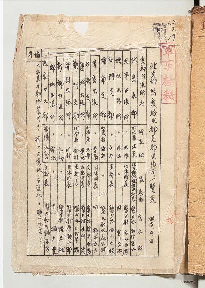《北支那防疫给水部支部出张所一览表》的右上侧盖着清晰的“军事极秘”印章,表内该部队本部位于北京,下属有石门(石家庄)、济南等5个支部,天津、塘沽、青岛等7个派出机构,各机构负责人的姓名、军衔等信息一应俱全。