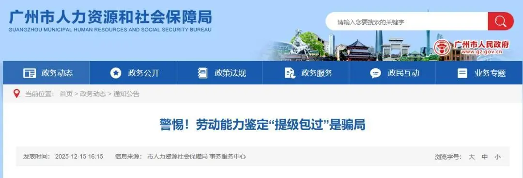 广州市相关部门严正声明:警惕!劳动能力鉴定“提级包过”是骗局