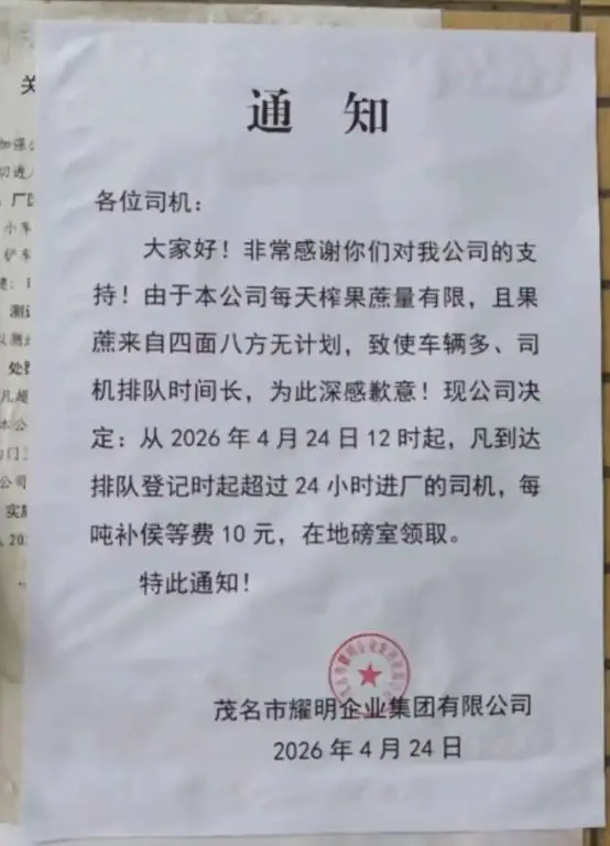 目前,工厂已克服了初期技术困难,果蔗出糖率“不算很差”。但他也坦言,后期糖分转化问题仍是潜在风险。据了解,耀明糖厂已实行24小时不间断生产,并为排队等候的货车司机免费提供饮用水和一日三餐。 另据潇湘晨报,4月24日,继为排队司机免费供餐后,耀明糖厂又推出一项新福利:等候时间超过24小时的司机,每吨可获10元补贴。