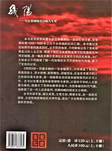 ![]() 在中国大规模上山下乡运动五十周年之际,一部反映知青岁月足迹和时代心声的著作《残阳》正式出版发行。该书是江苏省常州市知青协会主持编辑的大型知青回忆录文集,是反映常州地区知青上山下乡和后知青时代生活、情感、思想的纪实汇篇。该书通过多位作者的真实回忆和思考反省,从不同角度、不同侧面记录了一代知青的人生足迹和思想变化,展示了他们历史长河中的喜怒哀乐和观念碰撞,是一代知青岁月印记和时代风貌的记录,也是当代社会急剧变迁的历史画卷。 ![]() 《残阳》由常州知青文化研究会会长顾林芳为总策划;刘天云为主编;张浩典、储晓东为副主编;刘增献为责任编辑;由香港资深传媒人、专栏作家、书评家张穗强为出版人并作序,香港历史文化出版社出版。《残阳》全书分上下卷两大册,含50多万字,100多篇文稿和100多幅照片。全书分序言篇、追溯篇、本我篇、纠结篇、反省篇、感悟篇、留痕篇、出彩篇、情缘篇和附篇十大栏目,是迄今为止反映中国地方知青文化最宏大的一部纪实文集。 该书内容十分丰富,道出了一代知青离别故土、异乡拼搏、求学攻读、艰苦创业、爱恨情仇、反省思考等不同阶段的人生故事,是凝聚一代知青生活历练和感悟探究的岁月之作。该书以通俗平和的人生故事为依托,以实事求是、客观理性为原则,既展示一代知青艰苦奋斗、为国奉献的时代气概,也体现了他们反思批判、觉醒呐喊的现实主义精神。该书图文并茂,文笔生动,情感丰富,是一部具可读性、交流性的优秀文学作品,适合广大知青朋友欣赏阅读。对了解近代华东地区的历史变迁和社会风貌,也有一定参考价值。 (香港历史文化出版社) 大型岁月文集《残阳》 ![]() 序 张 穗 强 笔者认识常州知青顾林芳多年,听她说这几年常州市地方文化研究会知青协会正全力准备出一本反映知青历史的书,没想到她会邀请我这个外乡人为该书作序。我想自己也是一名知青,与他们有相同的思想情感,为该书作序当然不能推却,更须尽心尽力,不辱使命才是。 我是1968届下乡的广州知青,曾在海南农垦度过7年的蹉跎岁月,今天,这部充满岁月情结的著作已由香港历史文化出版社出版发行。作为《残阳》的出版人,我得以最早看到这部回忆录的全部内容,对常州知青的岁月足迹和人生感悟,留下了深刻记忆。 知青是当今社会一个独特年迈的群体,既云集了一批社会精英,也涵盖为数众多的弱势人士。今天,他们的一举一动,他们的喜怒哀乐,他们的精神世界,一定程度展示了中国的过去、现在和将来。今天的知青不仅是一群人,它是一个时代符号,一个社会窗口。这一代人无疑在衰老中,在不断被边缘化;但历史不会忘记这一代人,不会抹去他们在伴随数十年华夏大地的风雨进程中,曾怎样闪烁着时代的光辉。 今天广大读者看到这本书时,会从“知青大事记”这一章里看到常州知青在1955-1985年那个特殊年代的一个个真实故事;看到他们的足迹;看到他们的人生;看到他们的爱恨情仇;看到在激情燃烧的不平静岁月里,他们是怎样用心灵和皮肉熬炼出难忘的生命悲歌。 《残阳》内容丰富,情节动人,全书含一百多篇文稿和一百多幅照片,从不同角度,不同侧面展示了常州知青当年的精神风貌,展示了他们今日的反思觉醒,是一部凝聚生活历练和感悟探究的作品,读后令人感叹,催人泪下! 全书以知青上山下乡足迹为主导,以“百花齐放、百家争鸣”为准绳,以实事求是、客观理性为宗旨,向外界生动展示了常州知青的内心世界。既再现他们艰苦奋斗、奉献国家的伟大实践,也凝聚他们总结历史、反省思考的批判精神。 《残阳》虽然记载的是常州知青群体的人和事,但具有典型的现实意义,极具社会性、代表性和批判性。这是一部真实记录知青人生际遇的书,一部铭刻知青岁月创伤的书,是一代同龄人心中热血与时代脉搏融合激荡的天书。 《残阳》通过常州知青离别故土、异乡拼搏、爱情婚恋、回城创业等不同人生阶段的真实故事,向读者展示历史长河中他们实实在在的“百味人生”。书中用生动感人的故事,平和朴实的语言,详尽完整的经历,写出了常州知青的喜怒哀乐,写出这一代人怎样走过从无知盲从,到绝望挣扎;从成熟觉醒,到探索奋起的人生之路。“后知青时代”故事在《残阳》整体中的占比很大,是本书的重点。 当书中这一个个熟悉而陌生的人物故事出现在我们眼前时,这代老年知青会感到格外亲切难忘。我们这一代人走到今天太不容易了,历史为我们和后代留下了太多不不能遗忘的感受,留下了太多需要重新认识的东西。 《残阳》不仅是写常州知青,而是在写一代共和国同龄人走过的路,写我们如何同国家民族一道,走出岁月迷茫,走出历史困惑,走向光辉灿烂的明天。《残阳》也不是一部普通回忆录,而是一代知青血泪浇灌的生命之作。它把我们带回那个不堪回首的年代,唤起我们的内心共鸣。也正因为如此,这部岁月之作今天才那样亲切,那样感人,折射出那样浓厚的岁月感和沧桑感。 今天,香港历史文化出版社向海内外知青隆重推出这部《残阳》,笔者和广大读者一样,备感历史浪花的无情冲刷。感谢《残阳》编辑部,感谢《残阳》文集各位辛勤耕耘的作者,你们为知青文化增添了光彩,为知青内涵增添了魅力,向历史展示了我们这代人的风骨和脊梁,令作品充满时代风采,