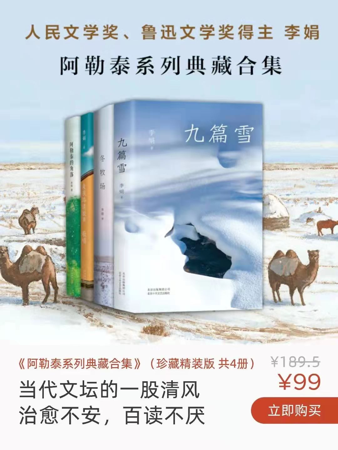![]() 她的文字,让我觉得惊为天人。我没办法用太多的评语去评论她,大家只能自己去读。 这位年轻的作家,就是来自新疆阿勒泰的——李娟。 ![]() 2010年,她横空出世,以“对牧民生活的细致描写”,炸响中国文坛。 作家陈村说:“这样的文字是教不出来的”。 李娟的伯乐刘亮程则说:“我为读到这样的散文感到幸福,因为我们这个时代的作家已经很难写出这种东西了。” 作家王安忆、人民文学主编李敬泽、编剧史航......惊叹于她的文字。 作品更是被央视《读书》栏目、《人民文学》杂志,争相推荐。 <《阿勒泰的角落》登上央视《读书》栏目> 即便是整个70年代的作家,也没有一个像李娟这样,能一出手,就得到如此广泛的赞誉。 而读过李娟文字的人,无一不为她的文字叹服,为她的真诚打动! 在知乎、微博、微信,关于好书分享的话题,李娟的提及率都非常高。 有人痴迷于她笔下的一个全新世界! 有人称奇于她对人物的传神拿捏! 有人惊叹于她“天才般的文字”,让人喜欢到停不下来! 而更多人则被她书中的某个人、某句话疗愈。 用史航的话来说:李娟,就是这样把世间的美好,若无其事地乘以二的人。 如果你至今,还未遇见一本能让自己“直呼过瘾”的书。我诚恳推荐你读一读这套——新经典出品的《阿勒泰系列合集》。 全套四册,精选收录—— 李娟成名力作《阿勒泰的角落》: 豆瓣9.1分,畅销十年,感动无数读者。在寂寥、贫瘠的荒野,看到生命最本真、最美好的姿态。 李娟成名处女作——《九篇雪》:《人民文学》杂志连载。一曲写实的西域牧歌,跟随李娟一家人,感受阿勒泰草原的生活日常。 人之所以能够感到幸福,不是因为生活得舒适,而是因为生活得有希望。 李娟最珍视的随笔《走夜路放声歌唱》:李娟首次在成长故事之外,展露自己的少女心事。每个人都在其中看到自己的童年。 李娟至今为止最重要,也最满意的作品《冬牧场》:见证哈萨克族最后的冬季游牧生活......生命、孤独、爱,都在这里得到另一种诠释。 柴静、王安忆等诸多名家推崇。 此次收录,全新珍藏精装版,全文精细修订,由李娟亲自撰写新版前言,新增26幅冬牧场实景高清插图。 为什么这么多人痴迷、惊叹、感动于李娟? 因为她笔下那个世界,太野生!太真实!太生动! 一家人住在用羊粪筑起的冬窝子,如果屋顶上有狗来回跑,羊粪末就会扑簌簌地往下掉。 因为缺水,李娟特别害怕别人来串门,因为她的羽绒服已经脏得看不出来颜色了...... 伫立都市的街头,脑海浮现这样的冬窝子,人会从心底,生出一种久违的亲切和欣喜来。 <李娟摄影的牧区生活> 而李娟的罕见,不止在她笔下那个独一无二的世界,还在她的真诚、喜悦、有趣和慈悲! 新书出版,别人抢着往上贴名人,她却再三劝说出版社不要添加“吓人的”腰封: “这一回,书的封底再没有贴名人荐语了……感到这才是一本真正属于自己的书。” <此次收录的新版《阿勒泰的角落》,不再有“吓人”的腰封> 当都市的人们奔波于欲望的满足,李娟的快乐却简单的像个孩子。 跟着妈妈,在新疆开小卖铺。妈妈吩咐她,收债去。 李娟就穿上自己的花裙子,换上精致的小凉鞋,一步一步,晃悠在黄土沙浪里。她一点都不着急: “要是一次性就把钱全收回来了,那多没意思啊。那样我的裙子和凉鞋,就没机会穿了。” 尽管牧民生活单调艰辛,她却在贫乏中,记录着“生活的可爱”。 “五大三粗的男人,趴在柜台上,花一两个小时,观察货架上的商品,最后才买一小瓶哇哈哈。” 正如一位读者所说:李娟的可贵,不在技巧,而在心。 庆幸这份真诚,得到了最热烈的回应。至今每一天,都有人在表达着自己对李娟文字的喜爱。 在荒野的世界,看见另一种人生 也看见人类相同的悲喜 除了天性的纯真和善良。 李娟的难得还在于,她笔下描绘的,是一个我们此生永无法经历的世界。 <李娟拍摄的牧区风景> “在这里,天空下最大的静不是空旷的静,不是岁月的静,而是人的静啊。” "邻居间第一天因为小事打架,青紫一片,第二天就上门做客,好似没事儿发生。” “搬家转场,路途遥远又艰险,也定要盛装打扮,以最得体的面容去迎接未知生活。” 更可贵的是,所有的个体在她的笔下,都显出生命可贵的品性。 印象最深的,是一个李娟母亲称之为“赖了好几年账的坏家伙”的人。 他不记得何时花了八十块钱,又买了什么。但仅凭认出了自己的字迹。他就在当天晚上,送来了二十元。 之后的八个月里,又分四次把剩下的六十元还清。 大学宿舍被窝读到这个故事,我真是大半夜笑出了声:“这个坏家伙”是真糊涂啊,也是真穷,可也是真的讲信誉。 <李娟拍摄的牧区风景> 李娟的笔下,有许多这样不完美的小人物:懒汉、酒鬼、粗人、小偷...... 可是她不去评判和定义,她只如实记录朴素生活的原貌。 但就在这朴素的日常里,人却从中获得巨大的满足和安宁。就像李娟在书中说的:物质生活一旦简单了,身边的一切也会清晰地水落石出,铅华洗尽。 书中嗅到涤荡人心的自然之美 读多少遍都觉得喜欢 以前看小说,最爱跳过去的就是景物描写。但李娟笔下的风景,是个意外。 因为她的文字,有一种野生的轻灵、自然,直美到你的心里。 “太阳未出时 ,全世界都像一个梦,唯有月亮是真实的; 太阳出来后,全世界都真实了,唯有月亮像一个梦。” <李娟拍摄的牧区风景> 不仅美,还有着恰如其分