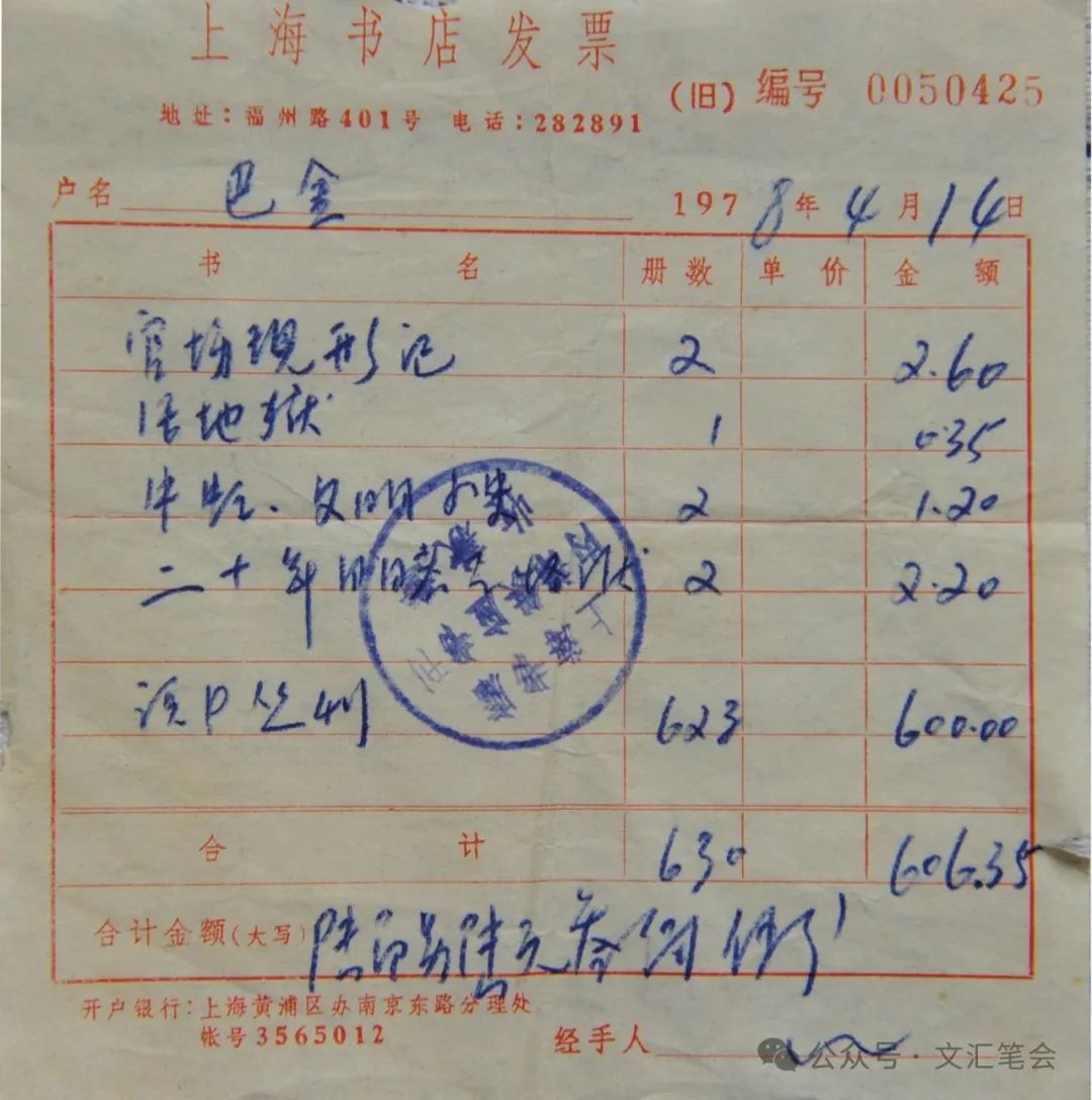![]() 巴金一生买了多少书,有大体数量,目前还难得精确统计,俗话讲,太多了,太多了。但是,他留下来的一张购书发票,却引得我去探寻巴金买书的故事。 这是一张编号为0050425的“上海书店发票”,抬头下是书店地址:福州路401号;电话:282891。上面盖的收款章上有“上海书店内部供应书刊”字样。“上海书店”是今天的上海图书公司的前身,它还曾用过上海旧书店等不同的名字。发票上的户名栏写的是:巴金。下面准确地列出巴金此次购书内容:李伯元的三部小说:《官场现形记》《活地狱》《文明小史》,吴沃尧《二十年目睹之怪现状》,都是晚清的官场小说。《牛虻》是伏尼契所写的一本在上世纪五十年代极受中国年轻人欢迎的小说。巴金自少年时代,就是一个小说迷,中外小说不知读了多少,这张发票也是他阅读趣味的显示。在发票的购书详目中有一部重头书,就是商务印书馆出版的一套《说部丛书》(发票上记为“丛刊”),计623册,六百元整。发票开出日是1978年4月14日,从当年的物价看,这并非小数目。当天巴金日记中曾记:“今天午睡半小时,两点光景魏绍昌来访,并取去代购书款六百元。”(《巴金全集》第26卷第232页,人民文学出版社1994年版)所付正是这笔书款,由此可知,这部书是魏绍昌代他买的。 ![]() 巴金不是研究近代翻译文学的学者,斥“重金”买这么一大套书,自然不是无缘无故: 我想起年轻时候读过一部《说部丛书》,这是当时商务印书馆出版的翻译小说,有文言,有白话,全用四号字排印,一共三集,每集一百种。这些书打开了我的眼界,使我关在家里也看到外面世界,接触各种生活,理解各样人物。我觉得它们好像给我准备了条件,让我张开双臂去迎接新的思想,迎接新的文化运动。书都是大哥从二叔那里借来的,为了这个我常常想起二叔。“文革”结束,我得到真正的解放后在旧书店买到一部这样的《丛书》,还有未出齐的第四集。我的许多书都捐赠出去了,这丛书我留着,作为感激的纪念,不仅是对二叔,而且也对大哥,对别的许多人,我从他们那里吸收了各种养料。没有从他们那里得来的点点滴滴,就没有今天的我。(巴金:《怀念二叔》,《再思录》第78页,作家出版社2011年4月版) 巴金故居中巴金藏《说部丛书》书橱 巴金晚年的确大量捐出藏书,他特意留下这部书“作为感激的纪念”,可见此书对他的特殊意义。这部书牵系着一份久违的亲情,他怀念二叔对于自己成长的影响。这部书也是巴金成长史中的重要启蒙读物,它打开了巴金的眼界,让他拥抱新思想。不仅是巴金,由商务印书馆于1903-1924年出版的这部书,是很多中国现代知识分子接触世界文学的重要渠道,在它的读者中有鲁迅、周作人、冰心、林语堂、钱锺书……这些名字。冰心说,到她十一岁时,已经看遍当时所有的《说部丛书》里的书;而钱锺书多年后还饶有兴趣地重读其中的林译小说。这部书对巴金的影响,在他晚年的重要作品《随想录》中也有体现,他谈到《说部丛书》中的《十字军英雄记》: 我十几岁的时候,读过一部林琴南翻译的英国小说,可能就是《十字军英雄记》吧,书中有一句话,我一直忘记不了:“奴在身者,其人可怜;奴在心者,其人可鄙。”话是一位公主向一个武士说的,当时是出于误会,武士也并不是真的奴隶,无论在身或者在心。最后好像是“有情人终成眷属”。(《十年一梦》,《巴金全集》第16卷第322页,人民文学出版社1991年版) 多年后,巴金仍然记得这句话,他甚至觉得这是自己在某一段时期个人心理状态的写照,他藉此反思某一种集体无意识,进而对历史进行反思,早年的阅读影响人的一生。 魏绍昌取走书款,书店开票,一周后,书送到巴金家中:“五点坐原车回家,旧书店已把《说部丛书》送来。”(巴金1978年4月21日日记,《巴金全集》第26卷第235页)《说部丛书》据学者统计总计324编[种](十集系列中有两种后来被替换,全书遂由322编增出两编),巴金藏的这套十集系列,共有97编,缺三编;四集系列,有321编,缺一编。两个系列合在一起,只缺四编,不要说个人藏书,就是在公共图书馆的藏书中,《说部丛书》能搜罗如此完整的,恐怕也不多,不少学者研究此书版本,都是依据电子版,原本书收藏便尤显珍贵。由此,我们不能不佩服上海书店的专业和搜书能力,它们帮助巴金实现了一个心愿,多年来为保存近现代珍稀书刊也做出了重要贡献。 巴金与上海(旧)书店关系密切,不仅托人买书,自己也多次登门。他的日记,随处便可拈出几条记录:1965年4月21日,“上海旧书店张世芬送《金日成选集》和《江姐》来” 。(《巴金全集》第25卷第509页)1979年8月23日,“上海书店陈同志送来港版书二三十册” 。(《巴金全集》第26卷第361页)1962年12月9日,“上海旧书店期刊部刘同志送目录来”。(《巴金全集》第25卷第192页)三天后,他亲自上门:“去外文书店和上海旧书店西书门市部购书若干册,并在期刊部楼上购得《文丛》一卷一至五、二卷一、三(两份)共八册(索价十八元,相当贵)。”(巴金1962年12月12日日记,《巴金全集》第25卷第193页)《文丛》是他自己编辑的期刊,抗战的烽火中,为了出刊,他曾带着纸型在日军轰炸下奔走。大约巴金本人也不存,“相当贵”,他也买下来。1963年1月22日,“九点半乘作协车去四马路外文书店、上海旧书店中文和外文门市部,以后又去中图公司二楼购《第四名》、《椅子》等内部读物数