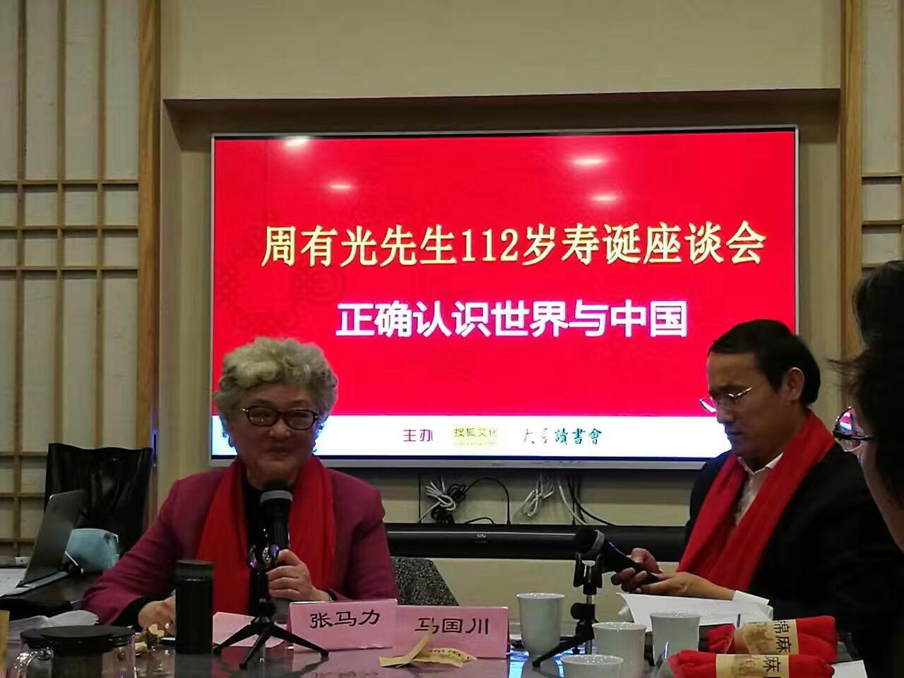 张马力 1月14日上午,周有光先生112岁生日的次日,部分专家学者在上海大隐书局为他举行了生日座谈会,本次活动由大夏读书会举办。周有光的外甥女张马力在论坛开场时向与会的专家、学者介绍了舅舅周有光的近况,称老人身体不太好,眼睛空空,他的心已经走了。