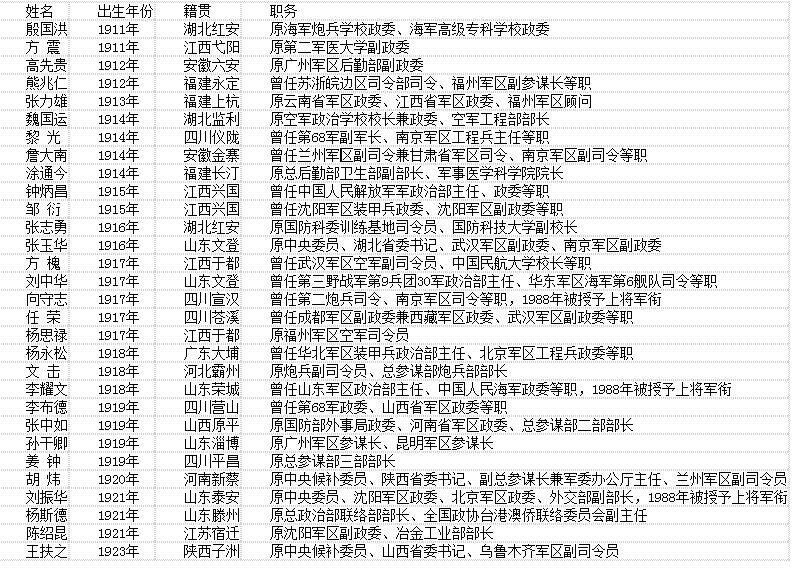 王贵德 自1955年至1965年间,我国共授予或晋升10名中华人民共和国元帅、10名中国人民解放军大将、57名上中国人民解放军上将、177名中国人民解放军中将和1360名中国人民解放军少将。 观海解局(微信ID:guanhaijieju)记者统计发现, 当年的1614名“开国将帅”到今天只剩下最后30名少将,他们年龄均超过90岁,其中有18人年龄已达100岁以上。 他17岁参军开创抗日敌后“麻雀战” 公开资料显示,王贵德出生于1914年,福建上杭人,1930年加入中国共产主义青年团,次年参加中国工农红军,随后加入中国共产党。1955年他被授予少将军衔,荣获二级八一勋章,二级独立自由勋章,二级解放勋章,1988年荣获一级红星荣誉功勋章。 提到王贵德,他的创立的“麻雀战”打法似乎为更多人所知晓。在其回忆录中曾提到,1937年11月26日上午9时许,敌步骑炮兵600多人的部队采用行军纵队,如同一般行军,不派侦察警戒。前面打响了,后面部队集结成集合队形,欺负我军没有火炮,以一路行军纵队大摇大摆地向范村走来。二营八连一排在范村西北接敌,当距离200多米时,伏击的战士一个排子枪撂倒四五个敌人。日军就地散开进行还击,步枪、机关枪、掷弹筒、火炮一齐向我开火,但未敢发起冲锋。同时,敌人骑兵五六十名向范村南前进。 团长徐深吉估计敌骑兵可能迂回范村,就指挥部队从村边隐蔽地撤退到范村东边占领新的阵地。敌人见没有还击,便向范村内一边打枪一边探头探脑地前进。当敌人继续前进到村东500 多米的小山前面,突然遭到猛烈的阻击,我军轻机枪、步枪一齐开火,撂倒敌人十几个。敌人就地展开还击,机关枪、步枪、掷弹筒一齐开火,接着炮兵也开火了,枪炮声在山谷中响成一片。敌骑兵也来到村东边,这时候我阻击部队又隐蔽地撤到北田受村西新阵地。敌人又打了一阵枪炮未见还击,又开始前进。我正面分队又撤到北曲河村西新阵地对抗,敌人恼怒地开始追击。 这时,八连二、三排各个战斗小组埋伏在北曲河北面山坡上,对进犯之敌展开了“麻雀战术”进行侧面射击,不但敌人的先头部队遭到打击,而且后续部队也同时受到打击。一排牵着敌人的鼻子在北田受、北曲河、西曲河、东曲河直至五公村山沟里,一步一步地诱进十来里路,打死打伤日军100 余人,打坏汽车1辆。战斗到下午3时,敌人收拾了尸体和伤兵开始撤退。七七一团二营各战斗小组继续侧击敌人,正面诱敌深入的一排跟踪追击,直追回到范村。敌人在范村抢走了老乡的几辆大车和十几匹骡子,把伤兵和尸体拉回太谷城去了。 这一天打了6个小时,敌人消耗炮弹200 余发,而七七一团却无一人伤亡。“只听敌人炮声响,未见我军有伤亡,消灭敌人保自己,这次战斗真漂亮。”王贵德政委将战报报告到师部,刘伯承师长表扬了七七一团二营,称赞这是一次典型的消耗战,消耗了敌人,保存了自己,并把这次战斗起了一个很形象的名字,叫“麻雀战”。 从此,“麻雀战”这一打法就被传开了。 千名“开国将帅”仅剩最后30名少将 1955年,中国人民解放军实行军衔制。开国将帅就是在此后一段时间内被授予军衔的中国人民解放军高级将领。 自1955年至1965年间,我国共授予或晋升10名中华人民共和国元帅、10名中国人民解放军大将、57名上中国人民解放军上将、177名中国人民解放军中将和1360名中国人民解放军少将。他们曾为创建中华人民共和国做出重大贡献,因此被人们称之为“开国将帅”。历史上曾有过4次开国少将授衔,最早的一次在1955年9月,798人被授衔。 观海解局(微信ID:guanhaijieju)记者查阅公开报道发现,聂荣臻是最后一位逝世的开国元帅,肖劲光是最后一位去世的开国大将,吕正操是最后一位逝世的开国上将,而最后一位开国中将张震也在去年9月3日溘然长逝,享年101岁。 从2010年至今,每年开国将军的陨落数量都在两位数以上,分别是2010年的29人,2011年的25人,2012年的14人,2013年的10人,以及2014年的14人,2015年的20人,2016年的10人。 截至目前,1614名“开国将帅”只剩下最后30人。 18名健在者年龄已达或超过100岁 在开国少将这一级,目前尚有30人健在,他们基本都是在红军时期就参加革命,平均年龄已近百岁。 据统计,目前,1955年授衔的少将共有12人健在;1961年晋升少将的军官中尚有7人在世;1964年晋升少将的军官中健在者共有11人。 观海解局(微信ID:guanhaijieju)梳理发现,如今30名健在的少将,其年龄都已经超过90岁,其中有18人年龄已达100岁或超过100岁。 30人中,年龄最大的是殷国洪少将,已经106岁,年纪最小的是王扶之,为94岁。 他们在人生迟暮之年依然心系国家,不仅有曾因立志导弹部队建设而改名的向守志在接受军报采访时怒斥周永康、徐才厚等大老虎;还有熊兆仁、张玉华在为扶贫攻坚贡献自己的力量。 向守志怒斥周永康、徐才厚等大老虎 1917年出生的向守志,1934年参加工农红军,1935年入团,1936年转入中国共产党。他三过雪山草地,从土地革命到抗日战争,从解放战争到抗美援朝,纵横沙场,南北征战,创造了许多经典战例,历任团长、旅长、师长、军参谋长、第十五军军长、炮兵技术学院院长、炮兵副司令员、第二炮兵司令员、南京军区司令员等职,是十二届中央委员、十三届中顾委委员。
