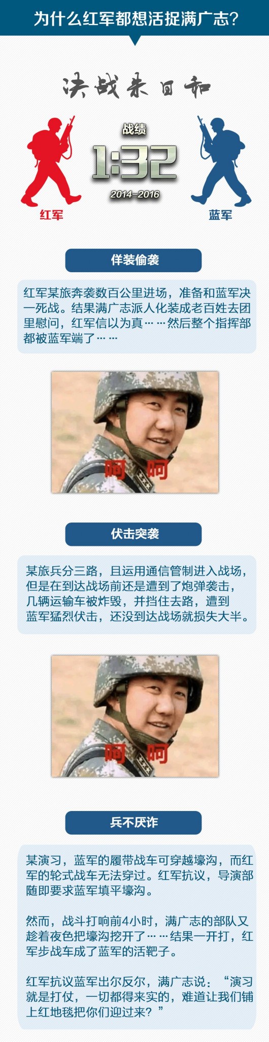 2015年6月,“跨越—2015·朱日和”系列实兵对抗演习打响。面对满广志一系列辉煌战绩,部分红军部队甚至打出了“踏平朱日和,活捉满广志”的口号。