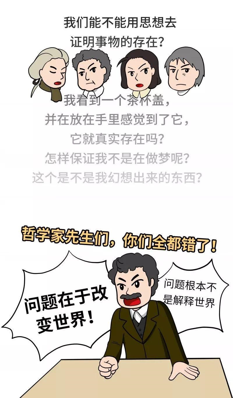 在两千多年的时间里,西方哲学也经过了不同阶段的发展。在中世纪神学,僧侣们讨论的是“一个针尖上到底能站几个天使”,到了近代,哲学家们讨论的是“人的理性究竟怎样认识世界”,如此等等。不管思想的主体是神还是人,重要的是思想始终是第一位的。 到了18世纪的时候,西方哲学进入了它的鼎盛时代,也就是“德国古典哲学”时期,代表人物是康德、费希特、谢林和黑格尔。特别是黑格尔的哲学成为了西方哲学的集大成,他把过去几千年哲学思考的所有方向和所有可能性,都用辩证法包含在内了。但是,仍然有一个最重要的问题没有解决:我们能不能用思想去证明事物的存在?我看到一个茶杯盖,并在放在手里感觉到了它,它就真实存在吗?怎样保证我不是在做梦呢?这个茶杯盖不是我幻想出来的东西吗?这个问题难倒了无数哲学家,康德甚至把这种难题叫作“人类理性的耻辱”。 这个时候,马克思平地一声惊雷:“哲学家先生们,你们全都错了!问题根本不是解释世界,问题在于改变世界!” ——就算我真的解决了用思维证明存在的难题,世界就能和平吗?人类就能解放吗?显然不能。 ![]() 在当时,德国人简直把苦思冥想伸到了极致,换来的结果是连隔壁法国的社会发展都超过了自己。在当时的欧洲,法国和德国之间存在着比较大的差别:德国在思想和哲学上高于法国,而法国在社会发展、文明程度高于德国。两国人对待同一件事的习惯也很不同,举例来说,如果让一个法国人和一个德国人去实现“自由”,这个法国人会拿起武器,走上街头,甚至会攻占巴士底狱来实现自由;而德国人却戴着睡帽在书房里安静地沉思,仅仅是在脑海中翻涌着颠覆世界的自由思想。 马克思认为,对于德国来说,不是想得太少,而是想得太多:有太多从事批判工作的思想派别,彼此之间互相写文吵架,但只是流于词语和表达形式上的争辩;真正要紧的是关注社会实际的发展变化,并展开切实有效的行动方案。 所以,马克思用实践的原则代替了思辨的原则,而“实践”就是历史唯物主义的真正基石与活的灵魂。马克思关注人,但不是像以往哲学家那样关注人的理性,而是关注人的现实生活,关注人的劳动生产。 ![]()