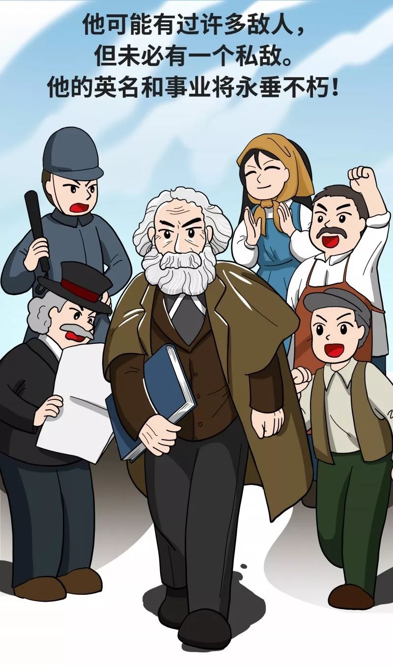 ![]() ![]() ![]() ![]() 1883年3月14日,星期三。午后,伦敦的上空布满了初春的浓雾,浓雾夹杂着雾霾一起透进室内。马克思坐在他的安乐椅上,从来都不闲着的琳蘅坐在一个角落里用钩针织什么。电铃突然响了。来访的人正是恩格斯。十多天来,恩格斯每天下午准时来看望病重的马克思。 琳蘅说,“您赶快请进,他快睡着了。” 当恩格斯同琳蘅走进房间的时候,伟大的思想家卡尔·马克思已经安静地长眠了。恩格斯站在旁边,肃立默哀。 恩格斯虽然对这个无可补偿的损失深感悲痛,却也为这来得突然的死亡感到安慰。在他看来,“医术也许可以使他再拖上几年,使他毫无希望地消磨残生而不是立刻死去,以此为医学技术增光。但这绝不是我们的马克思所能忍受的。面对着许多未完成的工作,渴望去完成它们而又无能为力,这样活着对他来说会比安然死去痛苦千倍。我们不能眼睁睁地看着这位伟大的天才憔悴衰老,消磨残生,去给医学增光,去受他在年富力强时痛骂过的人的嘲笑,——不能!他的逝世要比这强过千倍,我们后天把他送到他夫人安息的墓地去,要比这强过千倍。” 我们知道,长期高强度的工作和艰苦的生活条件,极大地摧残了马克思与他的家人的身体健康。在马克思生命的最后五年里,他饱受失眠、肋膜炎、肺炎、肺脓肿、脑神经炎和坐骨神经痛。燕妮的健康状况更加糟糕,她患了肝癌,全身的疼痛放到最大,卧床不起。 ![]() 有一天早晨,马克思感觉自己的身体好了一些,可以下床走动了,于是他慢慢地走进了燕妮的房间,坐在她的床前,抚摸着她的额头。这一幕被马克思的小女儿艾琳娜·马克思看到了,她后来回忆道:“我永远也忘不了那天早晨的情景。他们在一起又都成了年轻人,好似一对正在开始共同生活的热恋着的青年男女,而不像一个病魔缠身的老翁和一个弥留的老妇,不像是即将永别的人。” 1881年12月2日,天气非常寒冷,白天下雨,夜里是暴风骤雨。在燕妮生命的最后几小时里,她依然保持清醒,马克思陪在她的身边,燕妮的最后一句话是:“卡尔,我不行了!”然后慢慢地闭上双眼。 马克思的精神一蹶不振,他白发苍苍,双眼无神。一旁的恩格斯看见马克思的样子,低低地说:“摩尔也死了。” 恩格斯在燕妮的墓前发表了简短的演说,他在最后说道:“如果有一位女性把使别人的幸福视为自己的幸福,那就是燕妮。” 仅仅一年之后,1883年1月11日,当马克思的长女燕妮·马克思在巴黎逝世的消息传到伦敦时,已是风烛残年的马克思瘫在安乐椅中,老泪纵横。这时的马克思由于长期不断服药,以致药物对他的身体已经不再起任何作用,而只是使他食欲减退,消化不良。两个月后,他安祥而毫无痛苦地长眠了。 1883年3月17日,星期六,马克思被安葬在伦敦海格特公墓,安葬在他夫人的身旁。按照马克思夫妇生前的遗愿,他们希望免除一切仪式,因此,葬礼包括恩格斯在内只有八人参加,他们都是马克思一生忠实的老朋友。 恩格斯用英语作了题为《在马克思墓前的讲话》这篇著名的悼词。在2018年,马克思诞辰两百周年之际,如果我们停留在马克思的墓前,风中或许还能隐约可以听见恩格斯那浑厚的声音: “3月14日下午两点三刻,当代最伟大的思想家停止思想了。让他一个人留在房里还不到两分钟,当我们进去的时候,便发现他在安乐椅上安静地睡着了——但已经永远地睡着了。 这个人的逝世,对于欧美战斗的无产阶级,对于历史科学,都是不可估量的损失。这位巨人逝世以后所形成的空白,不久就会使人感觉到。 ![]() 正像达尔文发现有机界的发展规律一样,马克思发现了人类历史的发展规律,即历来为繁芜丛杂的意识形态所掩盖着的一个简单事实:人们首先必须吃、喝、住、穿,然后才能从事政治、科学、艺术、宗教等等;所以,直接的物质的生活资料的生产,便构成一个民族或一个时代的一定的经济发展阶段,人们的国家设施、法的观点、艺术以至宗教观念,就是从这个基础上发展起来的,因而,也必须由这个基础来解释,而不是像过去那样做得相反。 ![]() 不仅如此。马克思还发现了现代资本主义生产方式和它所产生的资产阶级社会的特殊的运动规律。由于剩余价值的发现,这里就豁然开朗了,而先前无论资产阶级经济学家或者社会主义批评家所做的一切研究都只是在黑暗中摸索。 一生中能有这样两个发现,该是很够了。即使只能作出一个这样的发现,也已经是幸福的了。但是马克思在他所研究的每一个领域,甚至在数学领域,都有独到的发现,这样的领域是很多的,而且其中任何一个领域他都不是浅尝辄止。 他作为科学家就是这样。但是这在他身上远不是主要的。因为马克思首先是一个革命家。他毕生的真正使命,就是以这种或那种方式参加推翻资本主义社会及其所建立的国家设施的事业,参加现代无产阶级的解放事业,正是他第一次使现代无产阶级意识到自身的地位和需要,意识到自身解放的条件。 ![]() 正因为这样,所以马克思是当代最遭忌恨和最受诬蔑的人。各国政府——无论专制政府或共和政府,都驱逐他;资产者——无论保守派或极端民主派,都竞相诽谤他,诅咒他。他对这一切毫不在意,把它们当作蛛丝一样轻轻拂去,只是在万不得已时才给以回敬。现在他逝世了,在整个欧洲和美洲,从西伯利亚矿井到加利福尼亚,千百万革命战友无不对他表示尊敬、爱戴和悼念,而我敢大胆