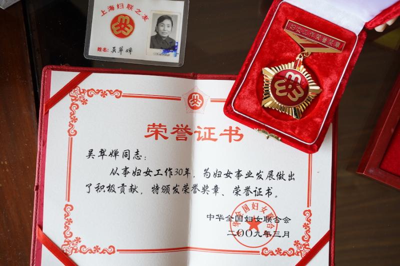 吴翠婵在妇联工作时的工作证和荣誉证书、奖章。