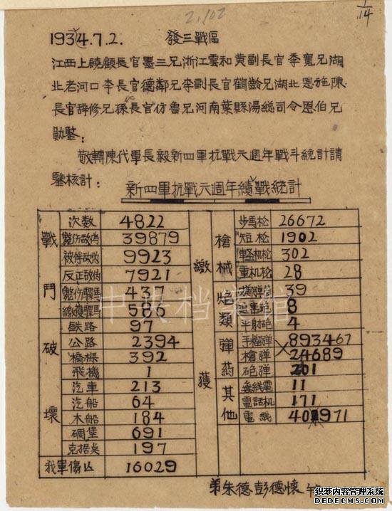 1943年7月2日:朱德、彭德怀致顾祝同等电:新四军抗战六周年战绩统计