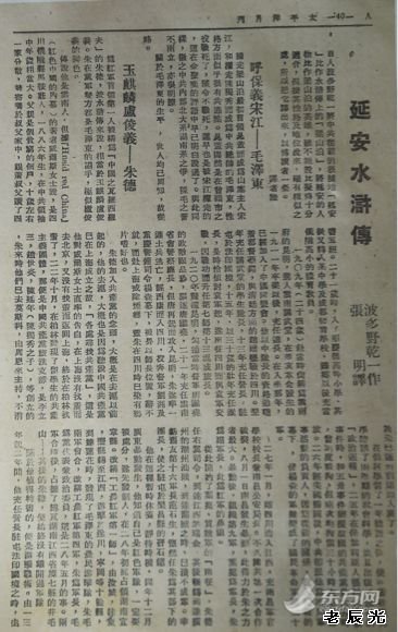 抗战期间,一本名为《延安水浒传》的小册子在日军指挥官中,几乎人手一册。此书由日本记者、"中国通"波多野乾一所著,将中共主要领导人、八路军高级指挥官与《水浒传》中的"108将"一一对应,详尽描述了他们的生平经历、性格特点。在《延安水浒传》中,毛泽东被称作呼保义,对应《水浒》中水泊梁山的领导人宋江;朱德则被唤作玉麒麟,对应108将中座次排在第二的卢俊义;周恩来因其足智多谋,对应梁山军师、智多星吴用。此次展出的《延安水浒传》,是刊载在杂志上的中文翻译版。 |