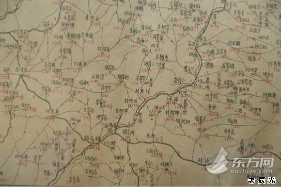 这张名为"线路图"的地图由十八集团军(即八路军)总司令部参谋处印制。地图详尽描绘了武乡、辽县、襄垣、黎城四地的交通路线,供前线部队参考。从地图局部可以看出,各村的名称下方均标注有红色的阿拉伯数字。按照地图左下角的说明,这些数字所对应的是各村的户数;而分数则表示该村遭日军烧毁的房屋比例。可见,八路军在山西战场对地形情况进行了详尽而又全面的调研。
