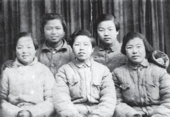 欢送延安大学同学张琪去东北,前排右起:欧阳代娜、张琪、孙静兰,后排右起:何理文、云泊娟
