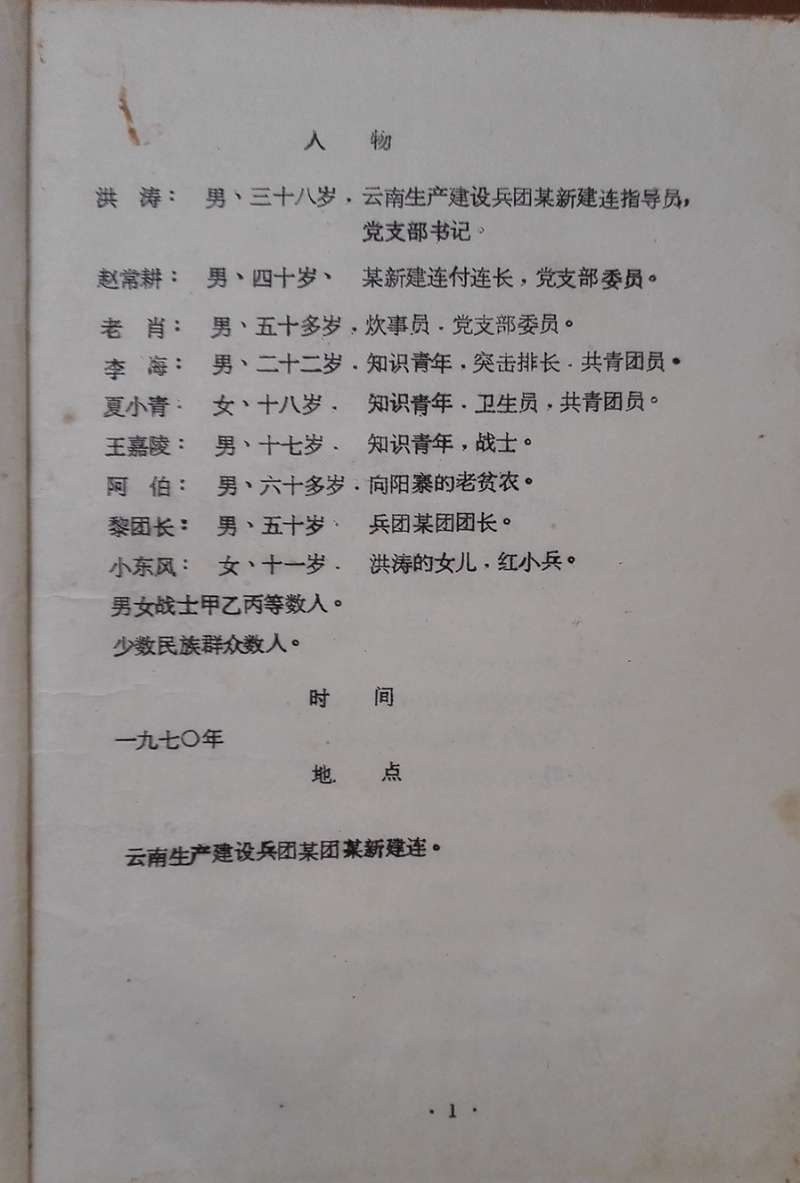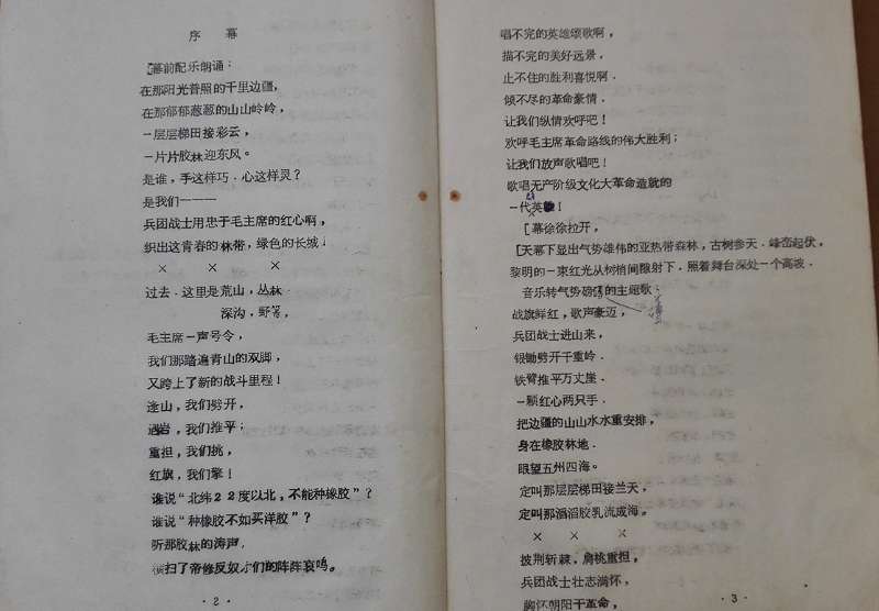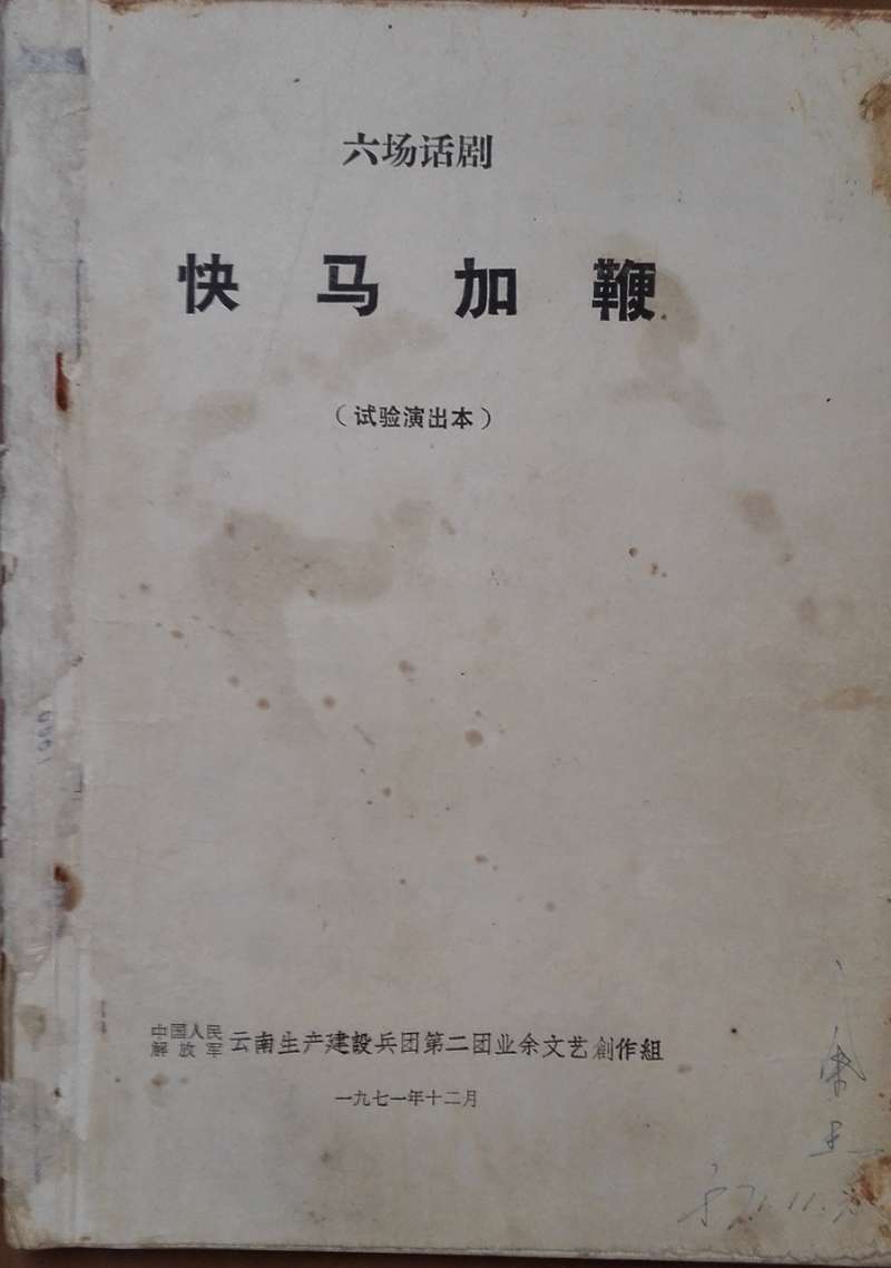 1971年12月,原云南生产建设兵团一师二团(1974年恢复东风农场)的团部宣传队,演出了一部六场话剧《快马加鞭》。![]() 自1968年开始,从北京、上海、重庆、昆明等地近2万名知识青年被安置到云南生产建设兵团一师二团。当时二团团部组建了以知青为主体的毛泽东思想宣传队。宣传队集中了具有文艺特长的知青。1971年起,宣传队开始创作六场话剧《快马加鞭》。在当年年底前在团部进行了首场演出后,到各个营进行巡演。 当年我结实了宣传队中的一位来自北京的知青,他参与了这部话剧的创作和演出。据他介绍,主创人员基本是来自北京的几位老高中的知青。参与演出的有来自四个城市的知青。演出结束后,他把这本话剧演出本送给我留作纪念。 当时的宣传队主要是结合形势演出一些小剧目。如三句半、快板、歌舞、合唱独唱、独幕话剧等。这是在云南东风农场由知青们创作的第一部大型话剧《快马加鞭》。 ![]() 以今天的眼光看,这部话剧无论是思想性还是艺术性都是无法加以评说的。那时处于“文革”时期,知青们刚到建设兵团。怀着开垦祖国第二个橡胶基地的热情,积极参与农场正在掀起大会战,开垦种植橡胶的梯田。这部话剧就是在这样的背景下创作的。 这部作品的产生就是那个年代的产物。一部多幕剧凝聚着知青们的心血和汗水。 以后我一直保存着这个原始的话剧演出本,上面还留有红土地的泥巴痕迹。尽管本子已经发黄发脆了,但这样具有知青痕迹的“文物”很珍贵,不可能再有了。 ![]() 2008年4月我到北京出差,遇到当年在一个农场的北京知青,其中有当年参与创作和演出的北京知青。大家谈及这部话剧,都为我能够保存下来的演出本感到惊讶。他们叮嘱我好好保存,这是我们那时珍贵的记忆。 2008年12月,云南东风农场庆祝建场50周年。农场专门建了一个“东风农场博物馆”,并广泛征集相关的历史文物。我不舍这本保存了近四十年的话剧演出本,专门复印了一本赠送给农场博物馆。 2009年7月,我有机会重返云南东风农场。在博物馆里看到了我赠送的话剧《快马加鞭》演出本的复印件摆放在展览橱窗里。 (责任编辑:晓歌) |