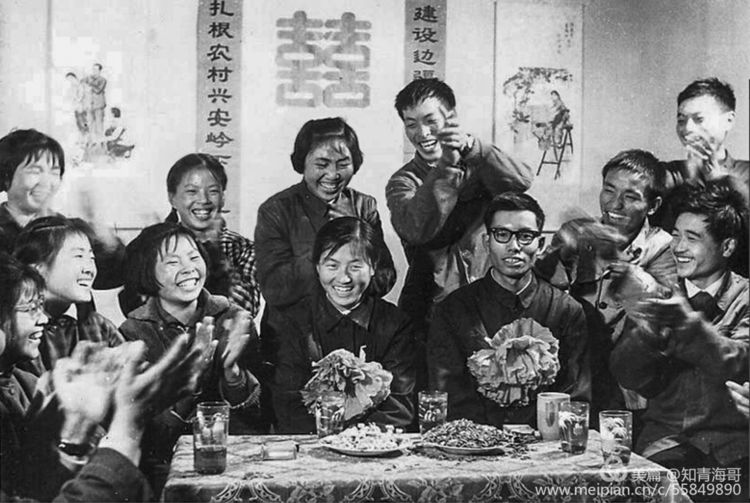 ![]() 知青婚礼 1975年 拍摄:高保鑫 《婚礼进行时》 男大当婚,女大当嫁。知青上山下乡,一晃几年过去,不谙世事的青年学生都到了谈婚论嫁的时候了。那时候,远在城里的家长最关心、最担心的就是恋爱婚姻问题。上面号召“扎根农村干革命”,而大多数家长和知青却不愿意一辈子远离故乡,更何况男人与女人之间并非都能碰出火花的,还有思想理念、生活习性、兴趣爱好等诸多方面的因素。因此,在农村成婚的知青中还是原籍同一的相对较多。 记得当年,大多数结婚的知青都是成双成对回到城里举行婚礼的,当然也有把自己最幸福的时刻放在农村的。那么,在农村的知青婚礼是怎样的呢?且看这张照片。 这是黑龙江省爱辉县四嘉子公社小三家子大队上海知青陈聚章和朱瑞丽于1975年国庆节举行婚礼的场面。不可否认这是一张难得的佳照,把一场知青婚礼表现得淋漓致尽。幸福的新郎新娘,欢快的兄弟姐妹,两朵大红花,几杯茶水,一些瓜子花生,构成了热热闹闹的婚礼进行时,大家发自内心的笑声和掌声似乎冲出了画面,回荡在我的耳边。 北大荒的秋季是最忙碌的,辛苦一年的收成全看这几天能否兑现了,以致国庆节都不能休息。那天一大早,小三家子大队的上海知青和社员们就出工干活了,其实这天是上海知青的一个重要日子,因为他们中的陈聚章和朱瑞丽定于这天喜结连理,晚上将举行婚礼,大家都惦记着晚上去闹新房呢。尚未经历过婚姻的年轻人一边干活一边议论着,大多数人对新人毅然选择“扎根”农村而肃然起敬。十时许,天上下起了雨,大田里和麦场上都不能干活了。不知是谁提议,陈聚章和朱瑞丽的婚礼不必等到晚上了,应该提前举行,这样就能热闹大半天了。大伙一起响应,呼啦啦涌到新房里。农村的事儿不隔墙,一会儿功夫,全村人都知道婚礼提前了,乡亲们悉数赶来祝贺,正在村子里的上海慰问团也来了,里三层外三层地把个小小的新房围了个水泄不通。 人都来了,气氛又相当热烈,婚礼自然水到渠成。 那年月是激情燃烧的岁月,提倡“破四旧”“立四新”①,要办革命化的婚礼。城里已经不兴新娘子穿婚纱好多年了,条件稍好些的新娘子穿着新缝制的红色“两用衫”,新郎穿一身卡其蓝布中山装就很不错了。农村条件差,新人只要穿得整整齐齐,干干净净的也一样成亲,只是新人们胸前必戴大红花。婚房亦无大讲究,不管土房还是砖房,糊糊墙纸擦擦炕,窗户贴上红喜字,两卷铺盖并一块,小日子便可过起来。 那时候还有不少单位把新人集中起来办集体婚礼的呢。四邻八里都来贺喜,整个村子就像过年一样热闹,大闺女小媳妇叽叽喳喳议论着新人,老爷子抽着烟袋瞧得双眼眯成了线,小伙子眼巴巴的越看越心焦,恨不得也立马讨个娘子来成亲。 自从陈聚章和朱瑞丽公开恋爱关系后,正合了上面鼓励“扎根”的心意,队里当然十分支持,专门在知青屋旁划出一块宅基地给他们盖新房。他俩都是要强的人,硬是自己脱坯,自己打草,自己和泥抹墙、上梁盖草,一应活计全靠自己两双手。一切妥当了,很多上海知青凑份子买了暖瓶、枕巾等生活用品赠与新人,再弄点瓜子花生的往炕桌上一放。上海知青李卫平写得一手好字,恭恭敬敬地献上一副对联,新房便充满了生气和活力。 当年结婚仪式都很简单,一般都是领导致词,新人表决心,再向毛主席画像鞠躬行礼,而后向领导、家长和来宾鞠躬行礼就算完事了,就那么简单。以笔者当年参加过的婚礼为例,也有讲究一点的,那就是给新人发一套扎着红带子的“红宝书”,外加一把新铁锨或新镰刀,足以让一对新人心潮澎湃一阵子的了。 陈聚章和朱瑞丽的婚礼也称得上是一个简单而又热烈的“革命化”婚礼。大队王书记讲了一番祝贺的话语,掌声过后就剩大伙一起欢乐了。上海干部高保鑫带着相机,招呼上海知青上炕去围着一对新人拍照。知青们一拥而上,欢笑着,嬉闹着,掌声,笑声都能把草房顶掀起来了。照片里的人,前排左起是丁永菁、周望琳、黄良芹、朱瑞丽(新娘)、陈聚章(新郎)、陈嘉荣;后排左起是白霞娟、陈蓓蓓、高云芳、闻龙、张焕祥、胡爱东。画面之外还有更多的人在鼓掌,在欢呼。这张照片留下了新人幸福的时刻,也留下了知青们在边疆农村的欢乐记忆。 陈聚章和朱瑞丽是全大队第一对在边疆结婚的上海知青。他俩都是68届初中生,都是1969年下乡的。陈聚章和朱瑞丽都是穷苦人家的孩子,家境都不怎么样。“穷人家孩子早当家”,他们自幼养成了勤劳节俭的好习惯,下乡后又得到了艰苦锻炼。陈聚章那时是队里的赤脚医生,他的动手能力非常强,认识很多中草药,不但会治病,还会做木工活儿呢。朱瑞丽更是个“小姐身材丫头命”,不仅长得清秀端庄,白如凝脂,非常漂亮,人也非常能干,不管是田里的重活,还是家里的细活,她都是一把好手。他俩在互相帮助中建立了感情终于走到了一起。全村人,不论知青还是乡亲都为他们能携手同组家庭而高兴,由衷地祝福他们。 都说苦难是条河,只要渡过去便是幸福。陈聚章和朱瑞丽婚后连枝比翼恩爱有加,第一个生下了“知青宝宝”,最后一个返回上海。返城后他们仍然努力地工作,特别是朱瑞丽入了党,提了干,从一个理发店的服务员,成长为中心店的党支部书记,靠的就是吃大苦耐大劳的那股劲。 知青伉俪同有一段上山下乡的经历,都经受了繁重劳动和艰苦生活的磨炼,奠定了