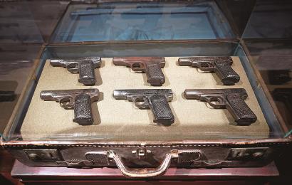 古戏台一侧阁楼里陈列的皮箱中放着几把手枪模型