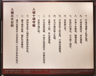 ![]() 《入城三大公约十项守则》 ![]() 上海解放纪念馆馆长唐磊讲述解放军入城后遵守十项守则的故事 ![]() 上海解放纪念馆 本版摄影 王 凯 ![]() 入城纪律(右) ![]() “人民保安队”臂章 ◆赵雁冰 在逼真的枪炮声中,可以身临先辈们英勇闯过的竹签壕沟;触摸水晶球,可以为长眠于此的烈士升起一盏盏孔明灯;透过老虎窗,可以看到当年上海市民为解放欢欣鼓舞的热闹场面……在地处上海北翼的上海解放纪念馆,馆长唐磊带着我们在三件文物中,重回当年解放上海战役的主战场,重温红色城市回归人民怀抱的历程。 阴阳相隔的“平凡”家信 烽火连三月,家书抵万金,在战争年代,每一封书信都是一份沉甸甸的思念,是一个百转千回的故事。在上海解放纪念馆二楼,珍藏着这样一封书信,信是丈夫张勇写给妻子胡兴野的。若是和平年代,我们一定不会刻意提起它的写信人和收信人的名字。但在解放战争时期,这“平凡”的家信背后,却有着一个悲壮的故事。 张勇,又名宋彬文,江苏启东人,1944年2月加入中国共产党。在解放战争中,张勇先后被编入华中野战军与第三野战军29军,参加了华中保卫战与淮海战役。在战斗中,张勇结识了在29军从事文书工作的胡兴野。两个有着共同理想的年轻人走到了一起,结下了深厚的情谊,于1949年3月成婚。作为解放军战士的二人来不及享受甜蜜,婚后不足三个月,张勇便告别妻子,奔赴解放大上海的征程。 时任第29军260团3营副指导员的张勇主要承担的是进攻月浦的战斗任务。月浦北靠长江,东临吴淞口,国民党军将其视为吴淞、宝山防御阵地的西大门。他们在月浦构筑了数百个钢筋混凝土碉堡与数十公里的壕沟阵地。同时还有装甲部队、炮兵部队、30余艘军舰以及驻扎在江湾机场的空军部队可以随时支援。也许是预料到了战斗的艰难,张勇在月浦攻坚战打响的前三天,给妻子写下了这封信,他饱含着对未来的希望,在信中写道:“我将愿贡献我的一切给这一战斗,为了永久的和平与享福。努力吧!” 1949年5月13日,月浦攻坚战打响,张勇所在的260团对月浦阵地发起了猛攻。经过一昼夜的激战,260团在月浦外围阵地站稳了脚跟,但随之而来的是敌军排山倒海般的反扑。14日中午,敌军派出坦克装甲营对阵地发起冲击,四辆坦克肆无忌惮地闯入前沿阵地。形势危急,看着身边的战友一个个倒在自己的眼前,张勇奋不顾身抱起集束手榴弹冲向坦克,与敌军坦克同归于尽,壮烈牺牲。战士们被张勇的牺牲所激励,用自己的身躯挡住了敌军的多次进攻。至黄昏时分,260团全团仅余120名官兵。 张勇的妻子胡兴野是在张勇烈士牺牲两天后,才收到这封书信的。面对沉重的打击,她悲痛欲绝,在信的空白处含泪写道:“1949年阳历5月14日午于上海月浦战斗中光荣牺牲。这是他过江后最后一次给我的信。收到此信时前二天,就传来了牺牲的消息。这是我一生中最大的刺激。” 边行军边背诵的入城纪律 1949年5月27日清晨,天空下着微雨,听了一夜枪炮声的上海市民战战兢兢地打开家门。他们对人民解放军的名头早有耳闻,却始终未曾目睹。但很快,映入眼帘的一番景象彻底打消了他们的疑虑。蒙蒙细雨中,所有的解放军都和衣抱枪、整整齐齐地睡卧在湿漉漉的沿街马路上。这一幕让上海市民感动不已,他们见过国军、日军、法军,但从来没有一支军队这样礼貌、这样秩序井然。这一幕让人民见证了人民解放军的严明纪律,也看到了未来的希望。而这一切的开始,还要从一本名为《入城纪律》的小册子说起。 1949年4月,解放军百万雄师渡过长江、解放南京,23日,丹阳解放,下一个目标就是上海。5月10日,陈毅在丹阳发表讲话,明确指出入城纪律是执行入城政策的前奏,是解放军给上海人民的见面礼。他反复强调,所有接管人员必须严格遵守政策纪律,无一例外。为了让大家牢记入城纪律,次日,一本本由三野政治部编印的《入城纪律》发到了战士们的手中。 为了方便携带,随时学习使用,这本小册子印制成口袋本,封面上写着“人人熟记,人人做到”。为了方便理解和记忆,三野还作了歌谣。如谈及宿营和在街道上的纪律:房子不能随便住,宿营必须听指令;不准乱跑乱游逛,先要请假后出门;不准随便乱打枪,军纪森严不容情;不准沿路拦汽车,走路要靠一边行;尊重风俗和民情,城市常识要弄清等等。 在从丹阳到上海的路上,即便是在行军途中,战士们也要将《入城纪律》的画片挂在背包上,时时背诵。一位三野的战士事后回忆道:“进上海的一路上我都在背,每天都要学习怎样入城和遵守纪律。” 今天,擦去历史的尘埃,重新审视这份中国共产党人送给上海人民的“见面礼”,一个被思考过无数遍、回答过无数遍的历史命题被重新激活:为什么小米加步枪最终获得了胜利?岁月无言,却早已给出答案。 弄堂里秘密制作的白臂章 在如火如荼的上海解放战役中,不仅有解放军英勇奋战的事迹,也有上海人民保卫家乡、迎接解放的故事。上海解放纪念馆展陈着这条微微泛黄却质量上乘的“人民保安队”臂章就讲述了一个感人的故事。 1949年初,国民党政府加快了其逃离大陆的各项准备工作,破坏或大量搬迁机器设备也在其中。他们想留下一个空壳子、烂摊子给共产党。4月,在党中央统一部署下,中共上海党组织广泛发动群众,开展反搬迁、反破坏和护厂、护校斗争。之前各企事业单位名称不一、大大