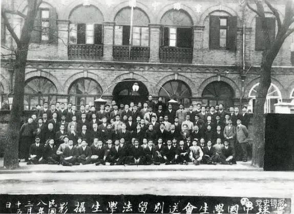 1919年3月14日,毛泽东第一次踏上上海这片热土。3月15日,毛泽东在寰球中国学生会会所参加赴法国勤工俭学学生欢送会,欢送第一批赴法青年。图为会后合影,后排右一为毛泽东